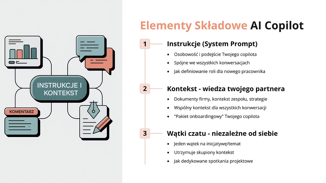 Najważniejszą cechą skutecznego co-pilota nie są “dobre prompty” tylko odpowiedni CONTEXT - głębokiej wiedzy i kontekstu dotyczącego Twojej pracy, firmy, zespołu oraz bieżących zadań i projektów.
