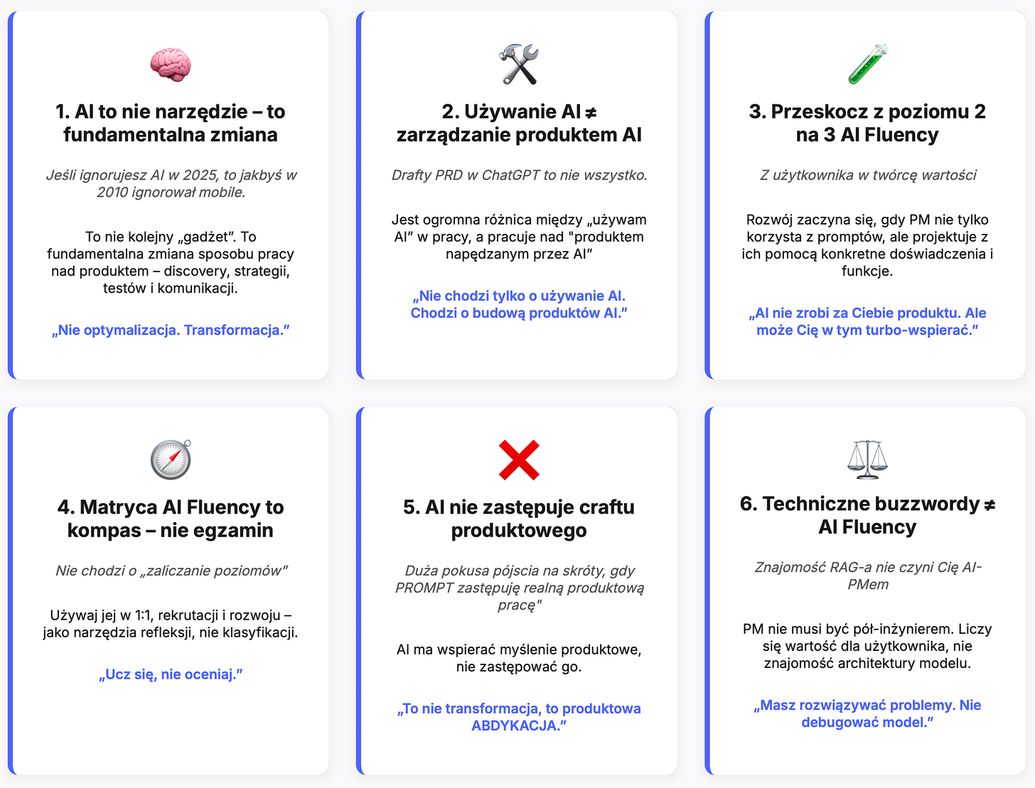 Ne można tej matrycy traktować jak twardej skali ocen. Ktoś może nie znać nazw architektur, ale świetnie integrować AI w workflow pracy PMa. Ktoś inny może znać buzzwordy, ale nie przekładać ich na wartość dla produktu. I na odwrót.