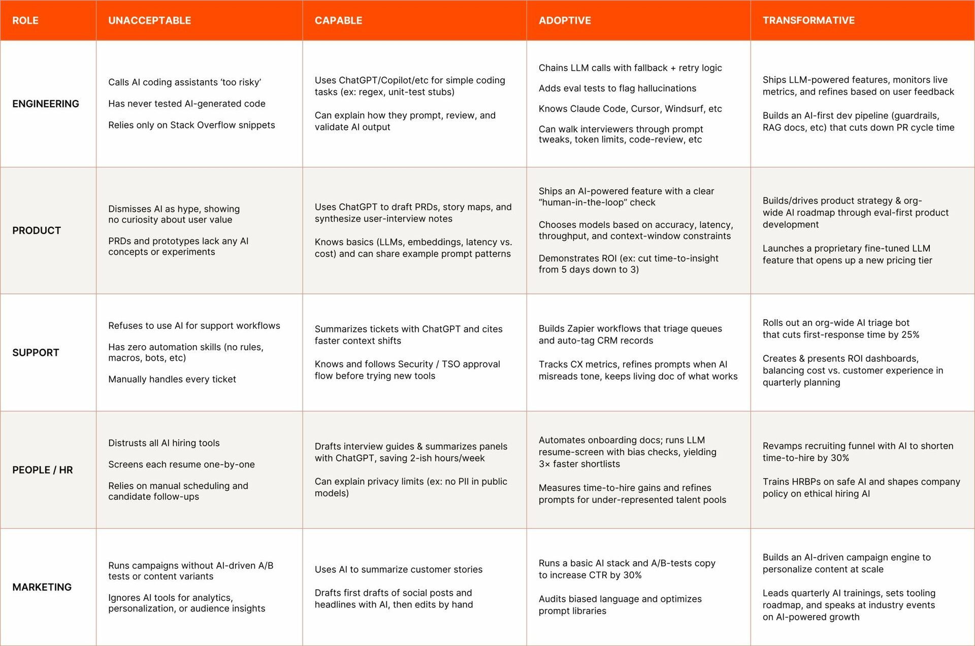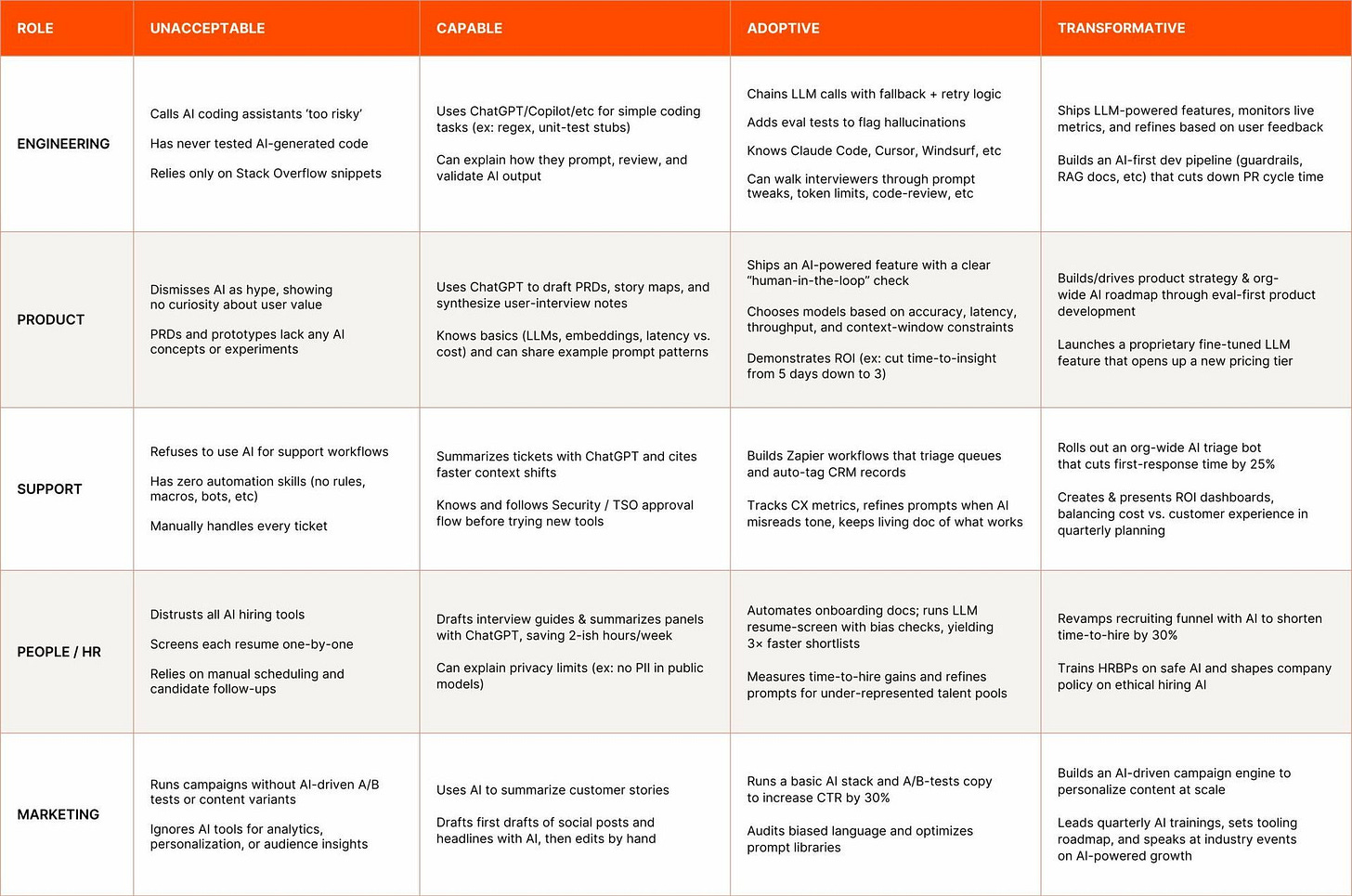 Trafiłem ostatnio na mega ciekawy artefakt od Zappiera (jeden z największych globalnych SaaSów do automatyzacji). Wade Foster (CEO Zapier) opublikował ich wewnętrzny framework - "Matrycę AI Fluency", którą Zappier używa do oceny biegłości wykorzystywania AI na różnych stanowiskach - w tym produktowych.