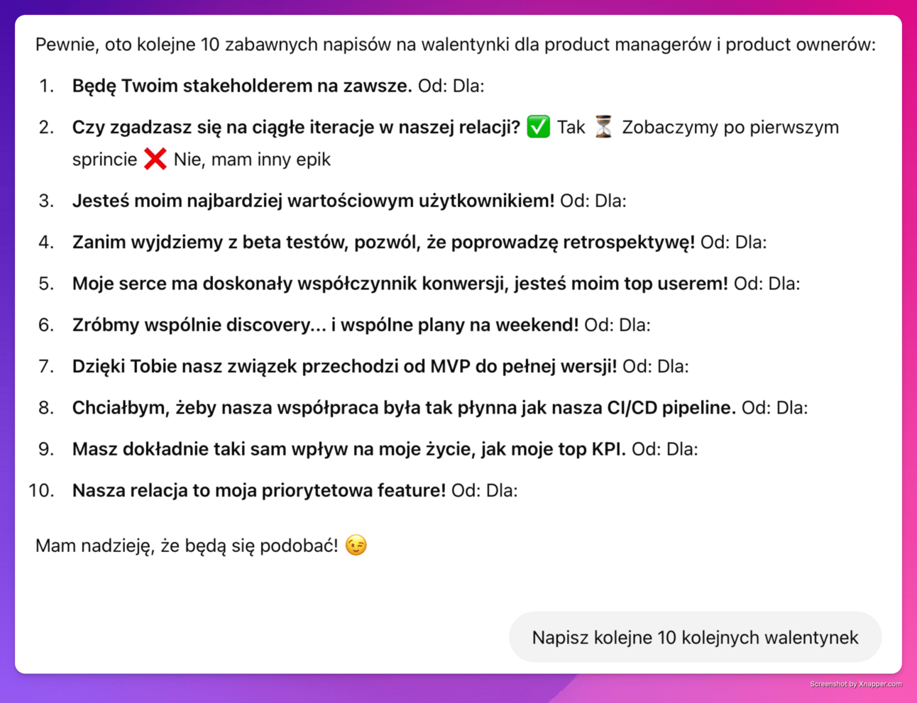Mogę już podsumować mój walentynkowy side-project: Generator Produktowych Walentynek 💖. Coś, co miało być bardziej praktyczną zabawą z AI i żartem, całkiem nieźle poniosło się w naszej produktowej społeczności ;).