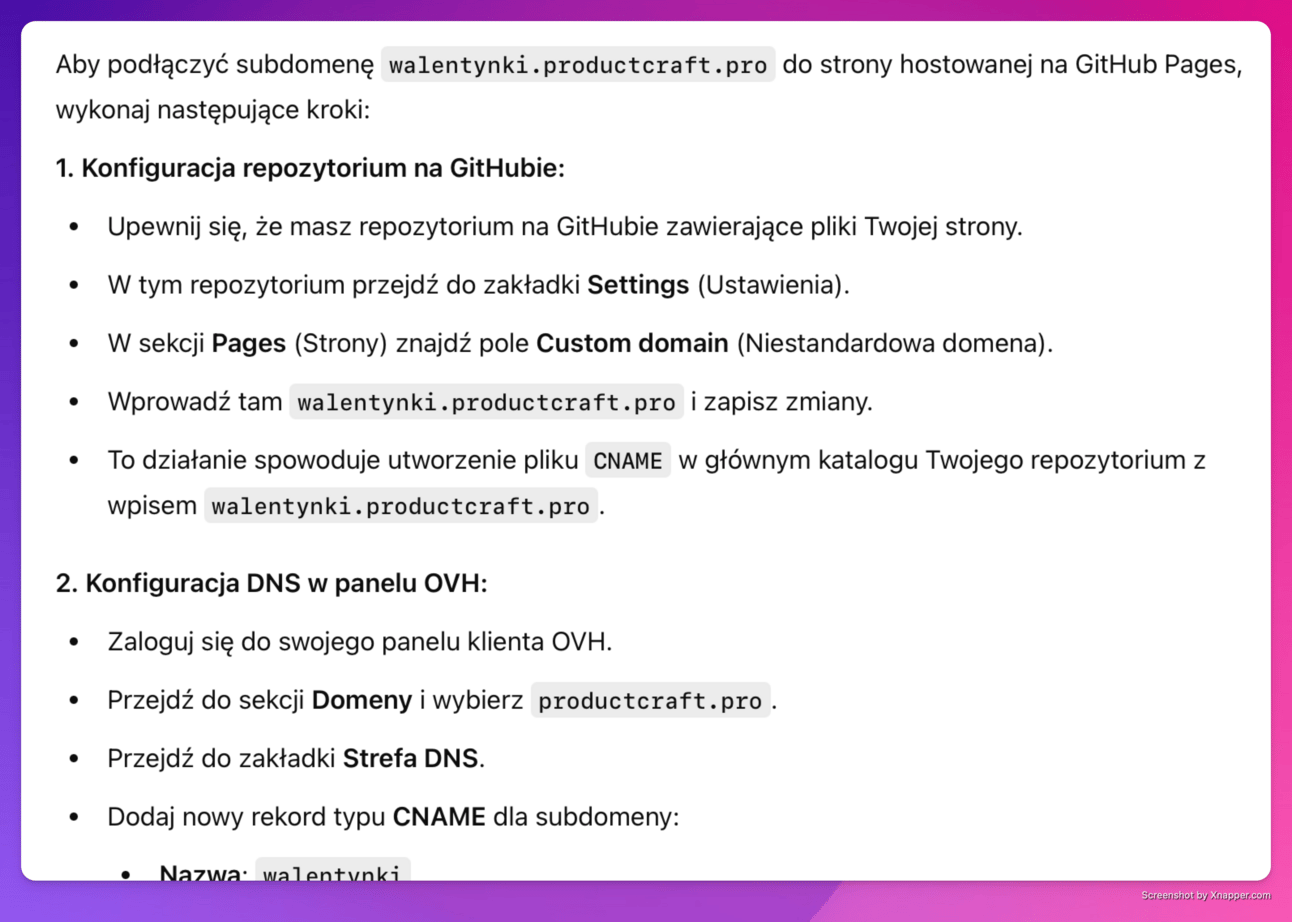 TOM: Jak podłączyć swoją domenę kupioną w OVH do strony w GitHub Pages. Mam domenę productcraft.pro (kieruje ona do newslettera na beehiiv), a chcę podłączyć subdomenę "walentynki.productcraft.pro". Przeprowadzić mnie przez ten proces krok po kroku.