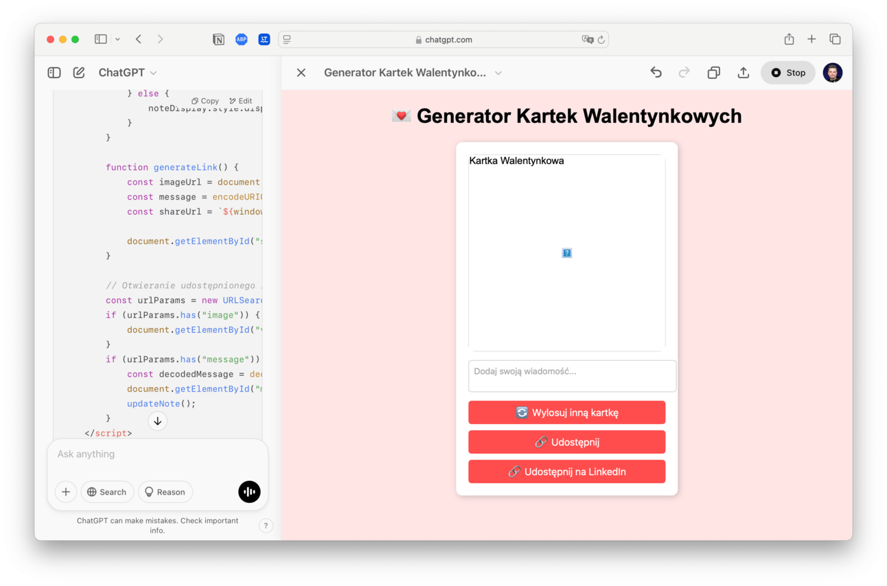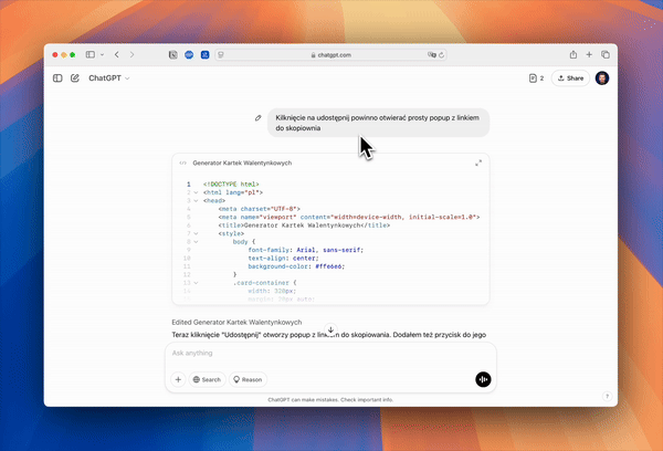 Dodałem możliwość udostępniania walentynki za pomocą linka (na prototypie od ChatGPT to nie działało).