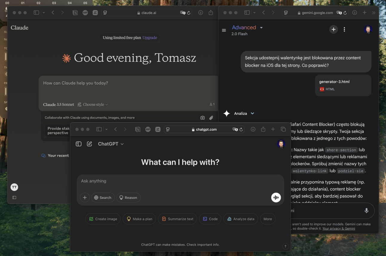 Najlepiej do pracy sprawdził mi się Claude oraz ChatGPT - używałem darmowych wersji, w ramach których jest limit na odpytywanie najnowszych modeli. Bardzo przeszkadzało, że jak osiągnąłem limit, to nie można było kontynuować wątku ze starszym modelem. Subiektywnie czułem też różnicę (na plus), gdy korzystałem z nowszych modeli. Dlatego, gdy wyczerpałem limit z Claude, to przełączałem się na ChatGPT, gdzie mogłem dalej konwersować z nowszym modelem.