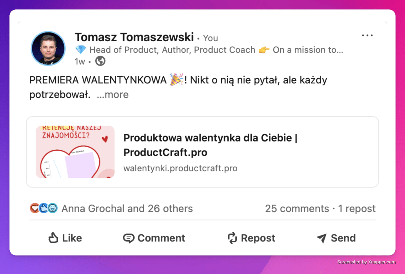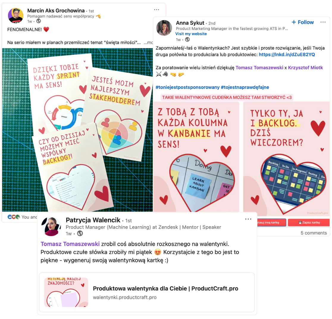 Wiele osób z polskiej społeczności produktowej udostępniło info o walentynkach. Także z poza mojej tradycyjnej bańki znajomych :). Oto kilka przykładów: Marcin Aks Grochowina, Anna Sykut, Marek Olczyk Brzeziński, Patrycja Walencik. Dzięki!