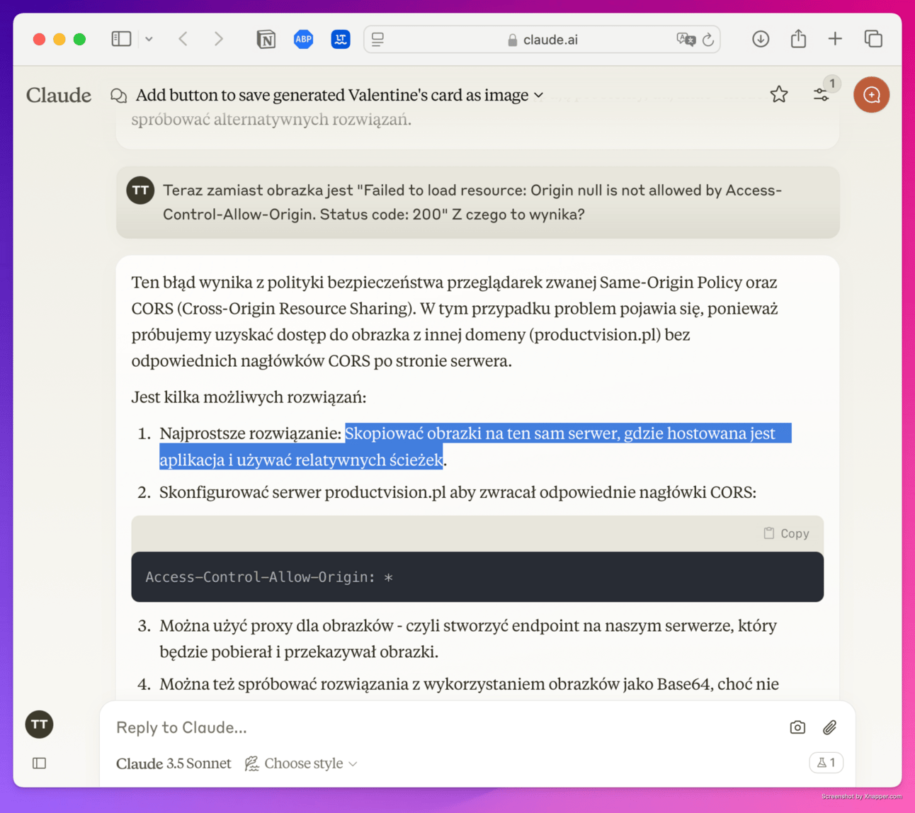 TOM: Teraz zamiast obrazka jest "Failed to load resource: Origin null is not allowed by Access-Control-Allow-Origin. Status code: 200". Z czego to wynika?Po krótkiej analizie z Claude, wybrałem najprostsze z sugerowanych rozwiązań: skopiować obrazki na ten sam serwer, gdzie hostowana jest aplikacja.
