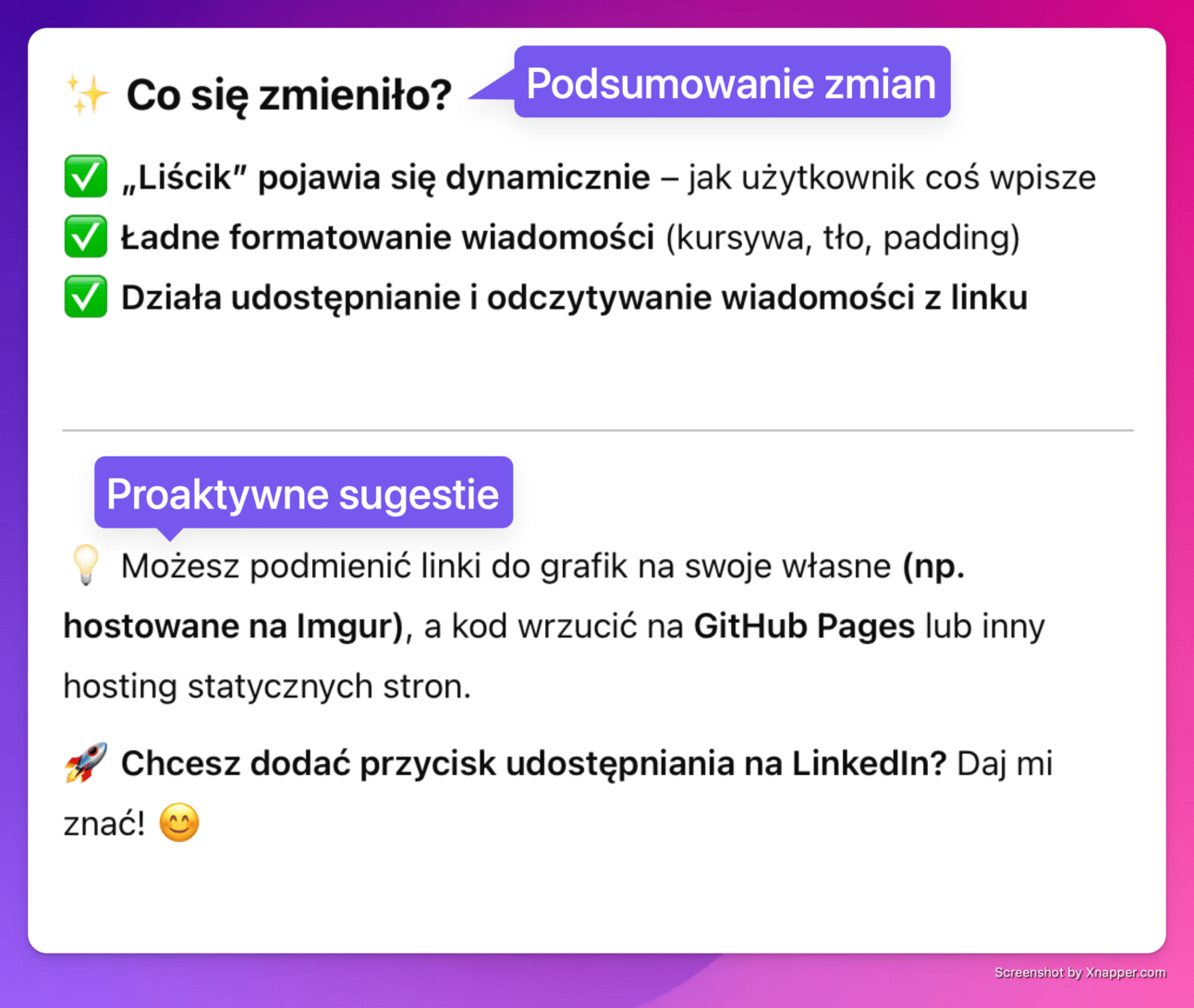 Kolejna fajną opcją było to, że chat tłumaczył swoje zamiany, sam proponował dalszy rozwój - zasugerował, gdzie wygnerowaną stronę można osadzić (przydało mi się to przy rozkminie na temat deploymentu) :