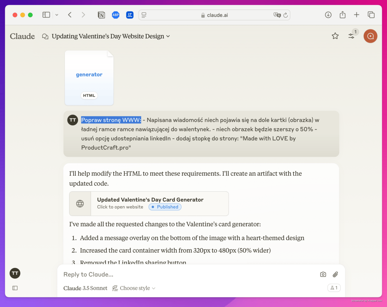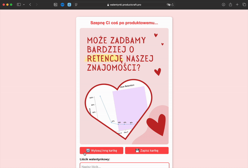 A oto finalny efekt mojej pracy: Generator Produktowych Walentynek, dostępny pod adresem: https://walentynki.productcraft.pro/
