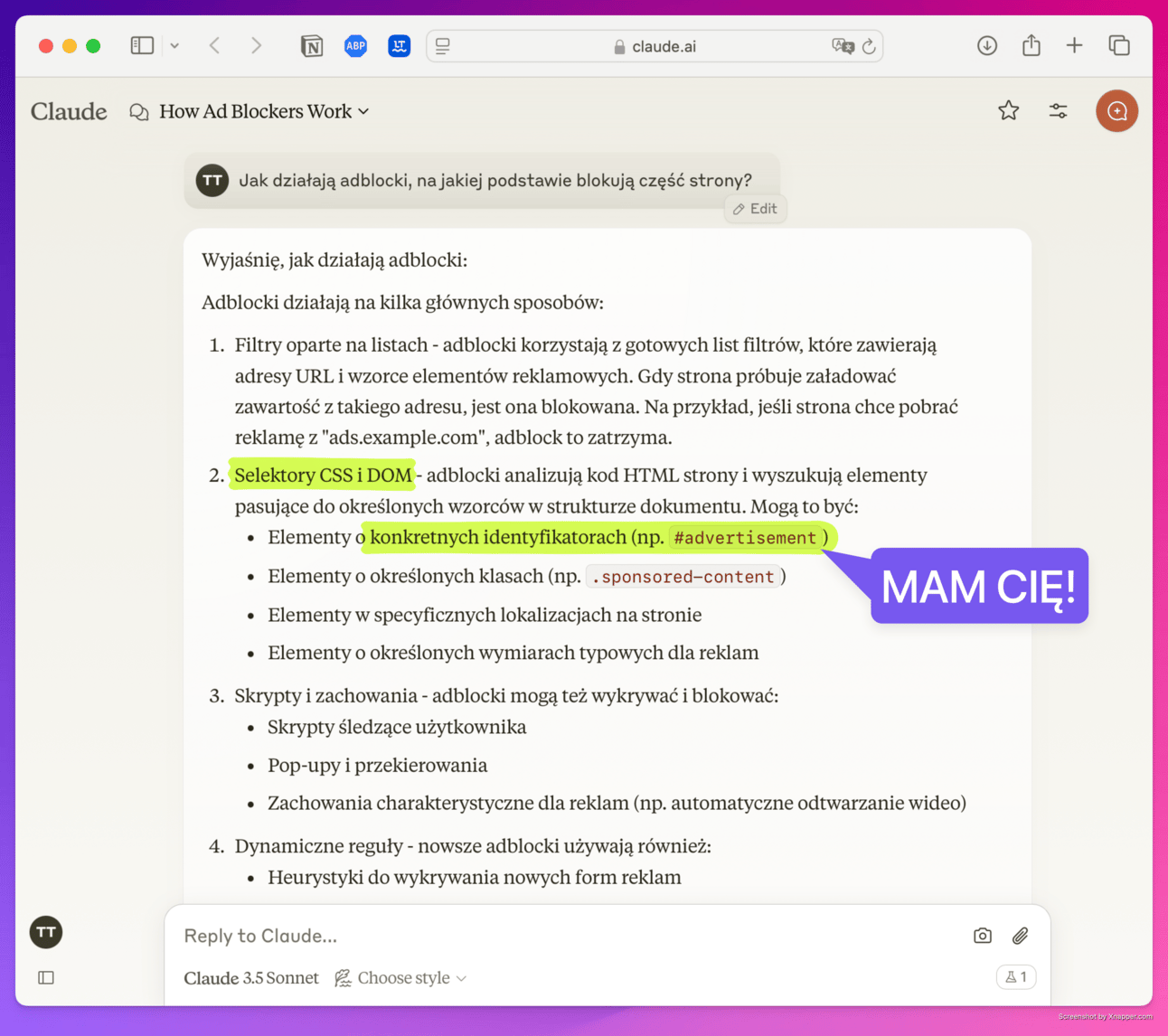 Chyba mamy to: "Selektory CSS i DOM - adblocki analizują kod HTML strony i wyszukują elementy pasujące do określonych wzorców w strukturze dokumentu. Mogą to być: Elementy o konkretnych identyfikatorach (np. #advertisement), Elementy o określonych klasach (np..sponsored-content)".