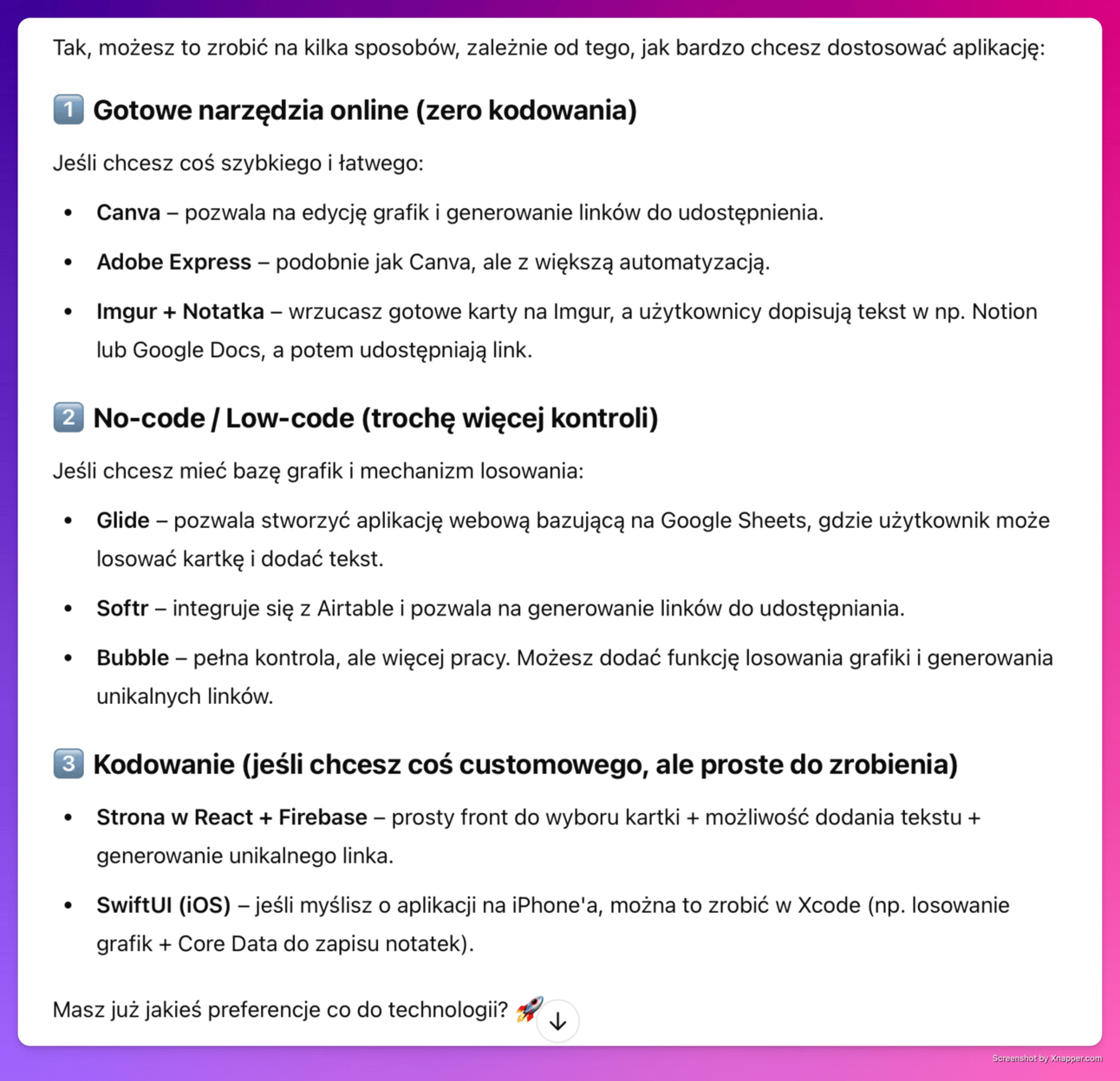 Na końcu chat zadał mi proste, ale dobre pytanie: “Masz już jakieś preferencje co do technologii?“