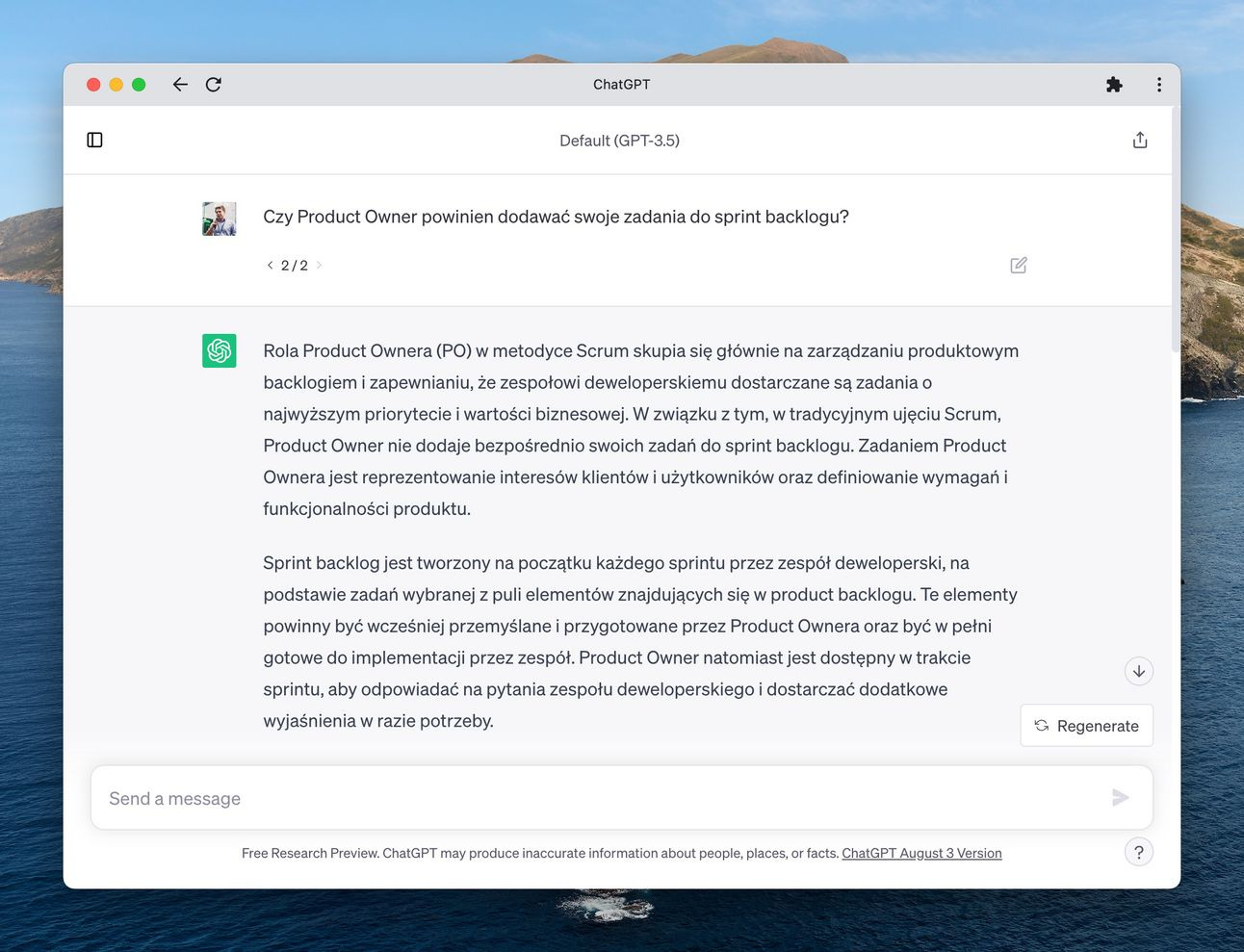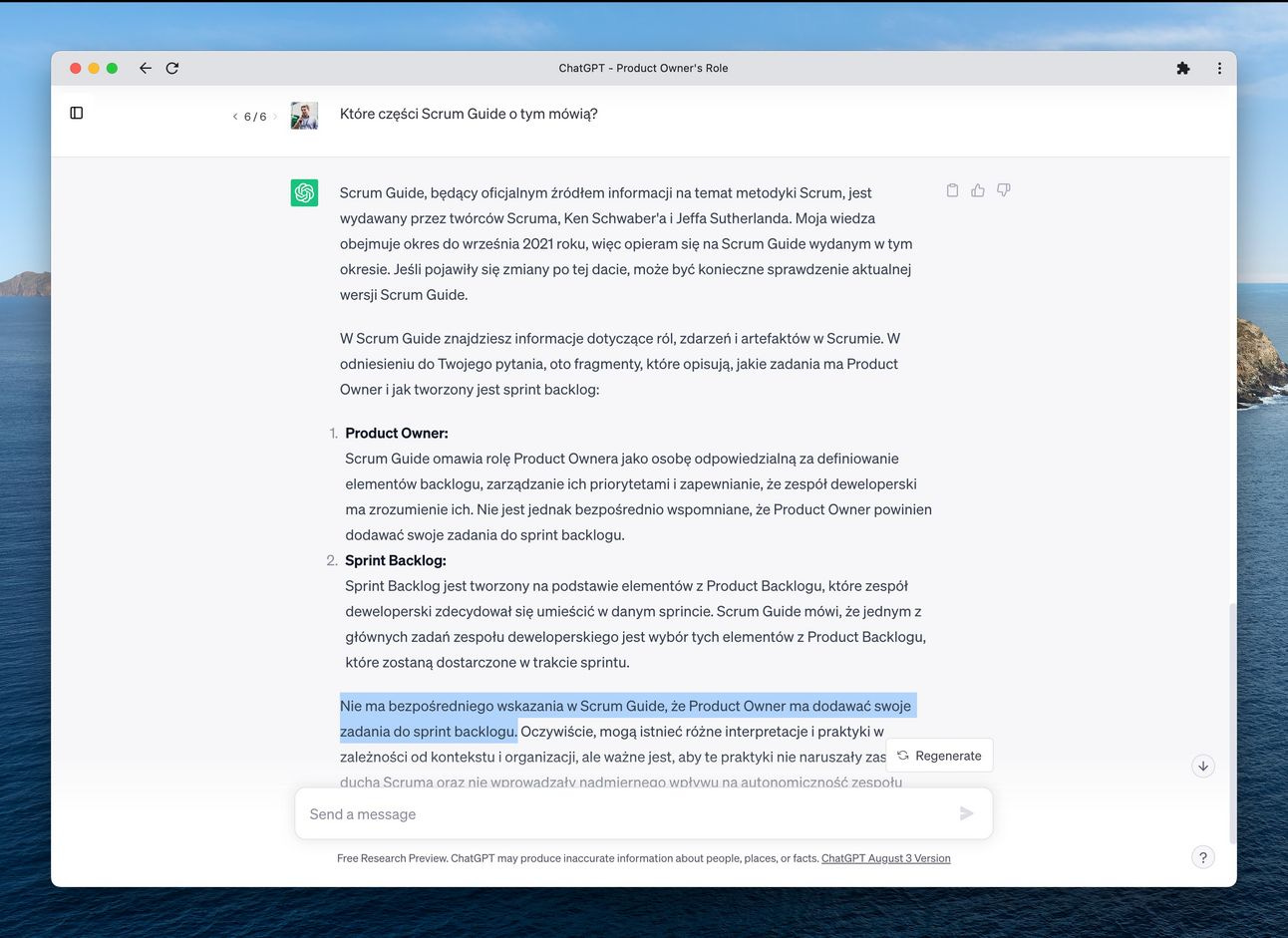Pierwszą sytuacją było generalne pytanie od jednego z moich początkujących product ownerów podczas naszego zespołowego knowledge sharingu: „czy PO może dodawać swoje własne zadania do sprint backlogu zespołu dev”. Zamiast odpowiadać wprost na to pytanie - skierowałem pytającego do mojego asystenta - chatGPT 😉.