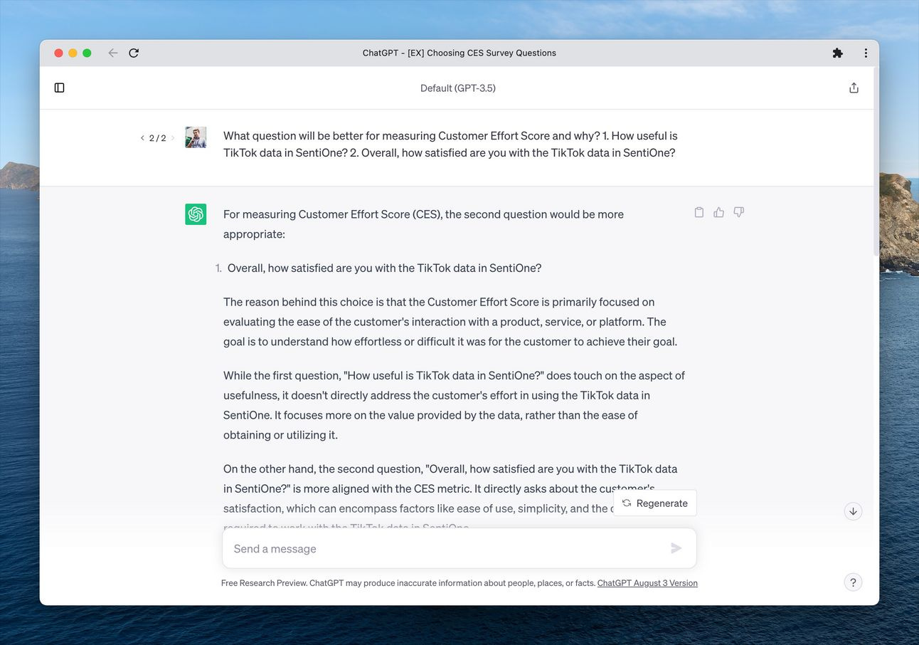 Kolejną sytuacja było wykorzystanie ChatGPT do lepszego doboru pytań do naszej ankiety Customer Effort Score (CES) do jednego z ficzerów. Product Manager miał 2 propozycje pytań do tej ankiety. Poprosiłem mojego wirtualnego asystenta o ocenę tych pytań oraz zaproponowanie dodatkowych jako inspiracji. Tu nam się do bardzo fajnie sprawdziło: