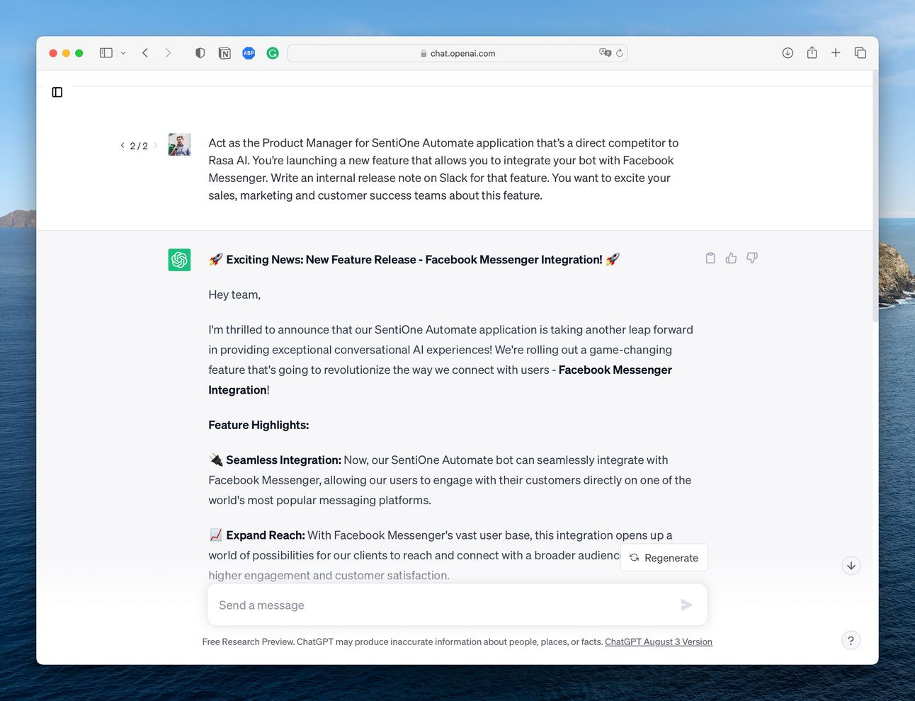 Act as the Product Manager for SentiOne Automate application that’s a direct competitor to Rasa AI. You’re launching a new feature that allows you to integrate your bot with Facebook Messenger. Write an internal release note for that feature. You want to excite your sales, marketing and customer success teams about this feature.