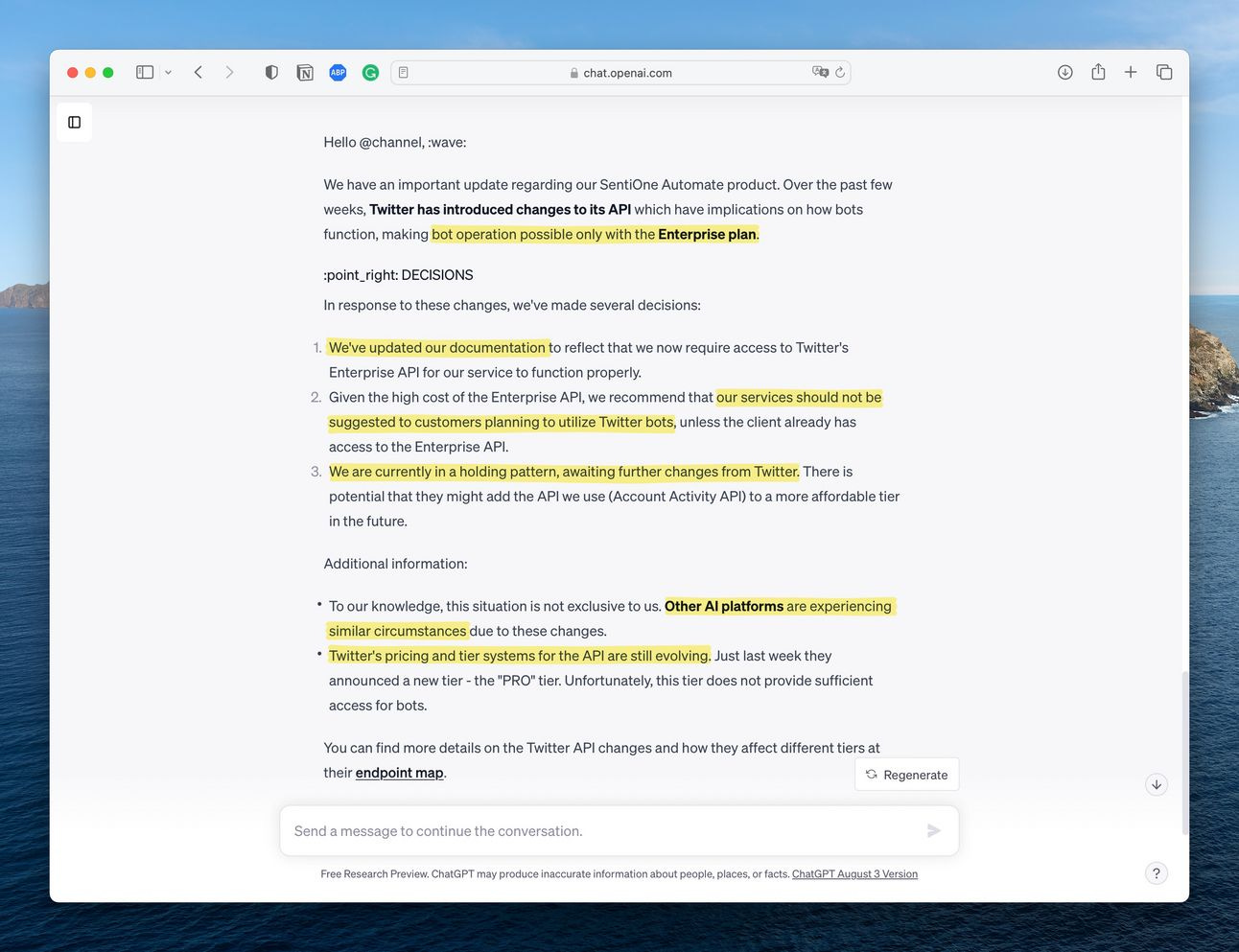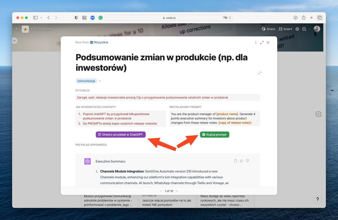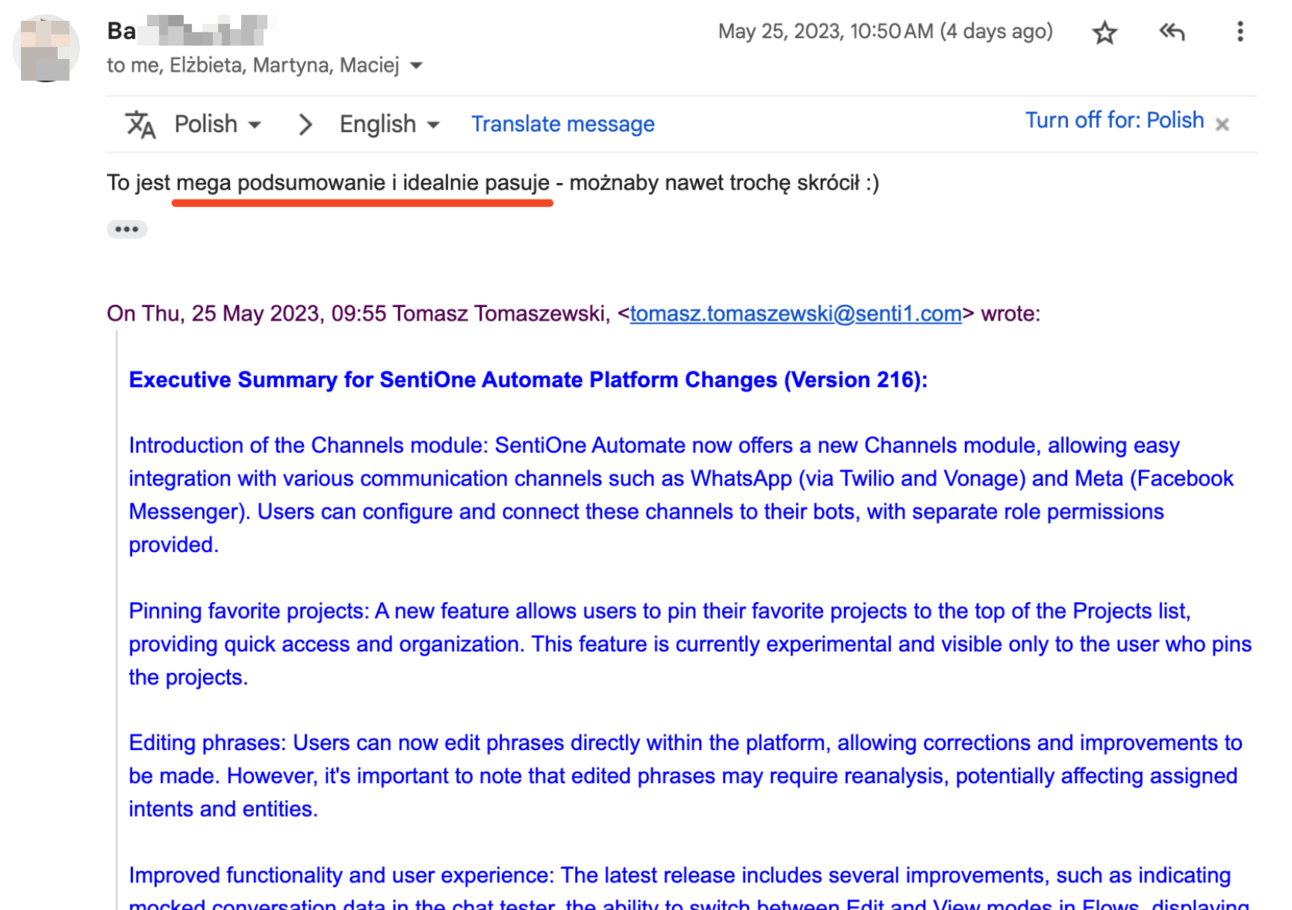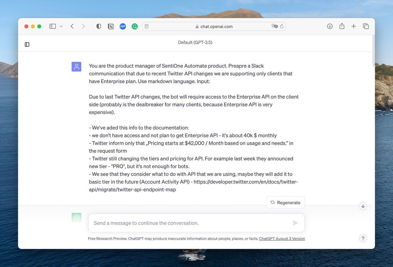 Od tamtej pory, za każdym razem gdy przygotowuje dłuższy komunikat, wykorzystuję do tego ChatGPT. Informacje o problemach w produkcie, zmianach w zespole, podsumowanie kwartału, status realizacji inicjatywy produktowej - we wszystkim tym pomagał mi mój wirtualny asystent. Zaoszczędziło mi to mnóstwo czasu.
