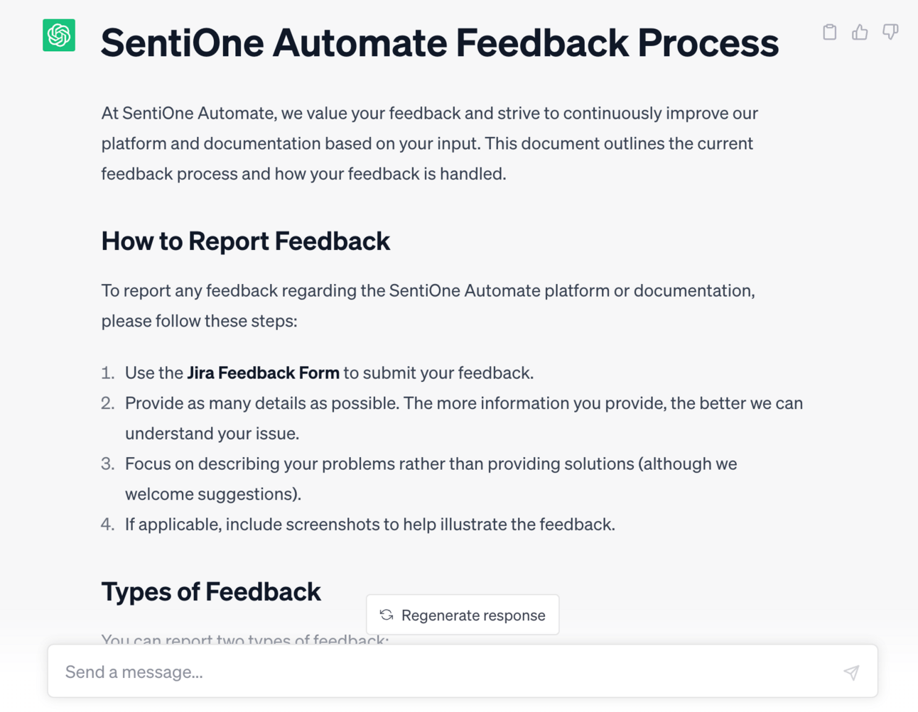 Ostatnim tematem do którego zatrudniłem mojego wirtualnego asystenta było pisanie dokumentacji. Mieliśmy do przygotowania publiczny opis/tutorial naszego nowego rytuału zbierania feedbacku od użytkowników w produkcie (jak zbieramy feedback, gdzie można zgłosić, co się z nim potem dzieje).
