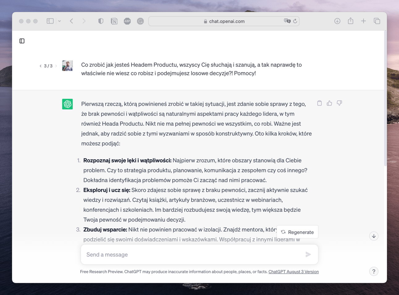 Naturalnie zacząłem też podpytywać mojego wirtualnego asystenta o rady przy konkretnych sytuacjach, które dotykały mnie lub mojego zespołu. Chciałem wiedzieć co „myśli” i czy zainspiruje mnie przy podejmowaniu decyzji, rozwiązywaniu problemów czy bardziej konkretnym odpowiadaniu na merytoryczne pytania.