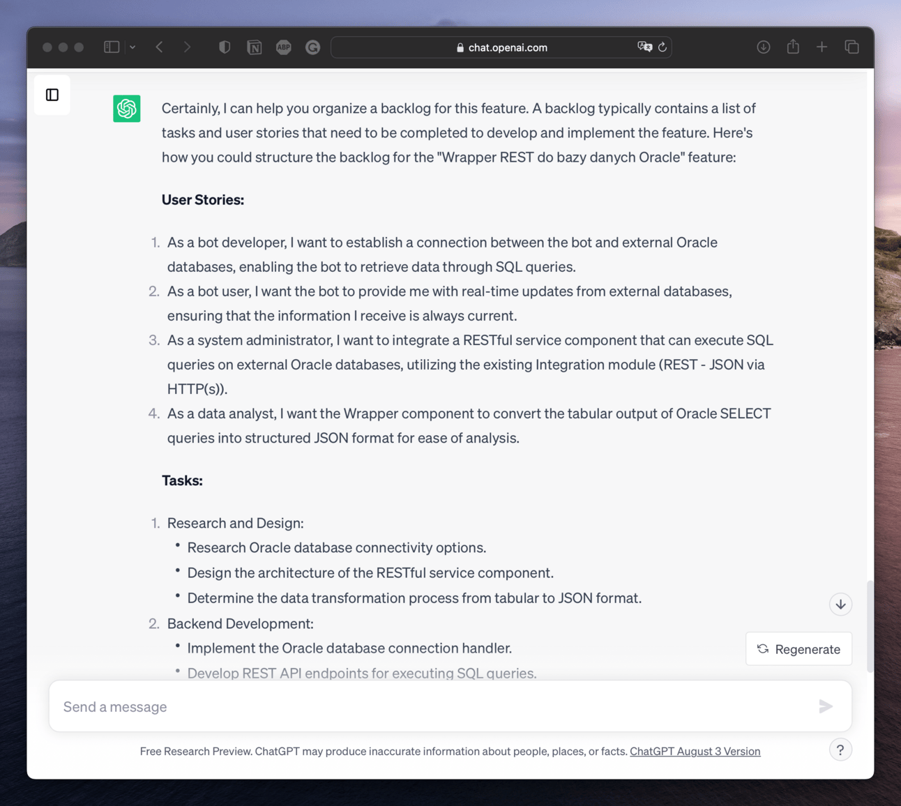 Powiem szczerze - zupełnie nie udało mi się tutaj wykrzesać z ChatGPT wartości dodanej. Ani do rozpisania ficzera na sensowne historyjki, ani do lepszego rozpisania pojedynczego taska. Wszystko kończyło się takimi, mało przydatnymi odpowiedziami: