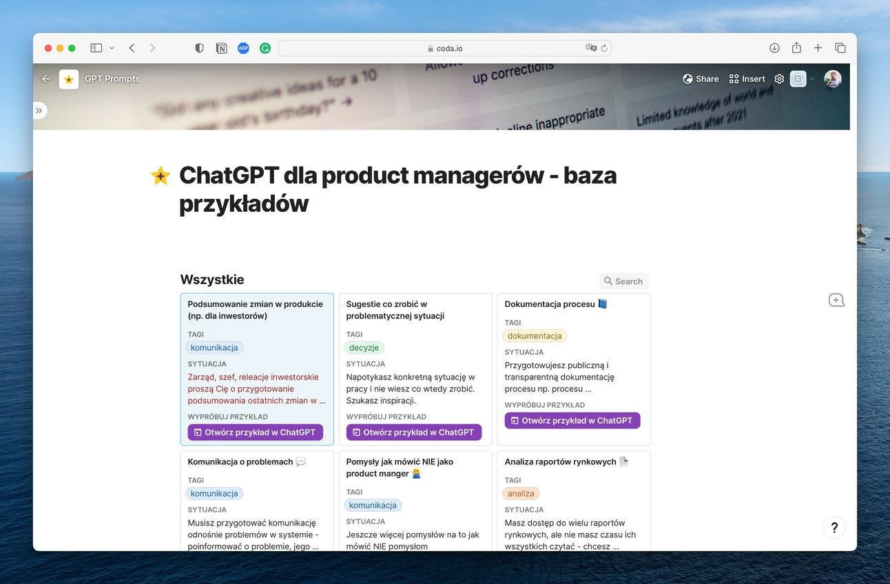 Podczas trwania tego 30-dniowego challenge'u stworzyłem swoją bazę realnych przykładów użycia ChatGPT w pracy product managera. Baza służy mi do zapisywania fajnych promptów, wskazówek i przykładów, by móc je potem ponownie wykorzystać w swojej pracy.