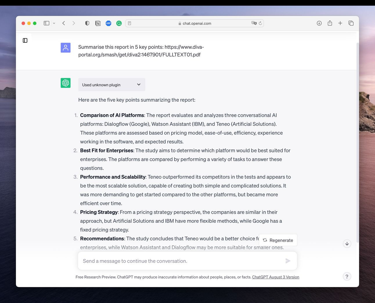 Postanowiłem więc zatrudnić do analizy raportu mojego wirtualnego asystenta. ChatGPT w wersji 4.0 ma opcję wtyczek, które pozwalają "zaimportować" dokumenty i wchodzić w nimi w interakcje - np. mogłem poprosić chatGPT o podsumowanie najważniejszych punktów, wypisanie wniosków.