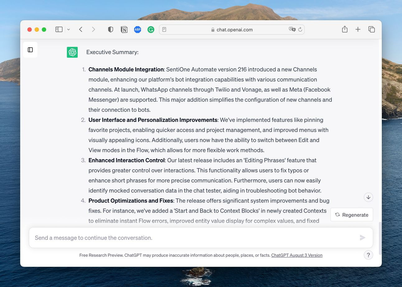 Przygotowanie takiej notatki co miesiąc, to już jednak 3x więcej poświęconego czasu. Postanowiłem więc zlecić to zadanie mojemu wirtualnego asystentowi. Poprosiłem go po prostu o przygotowanie „executive summary”, a jako INPUT dałem po prostu kopię naszych release notesów (zrobiłem zwykłe kopiuj-wklej):
