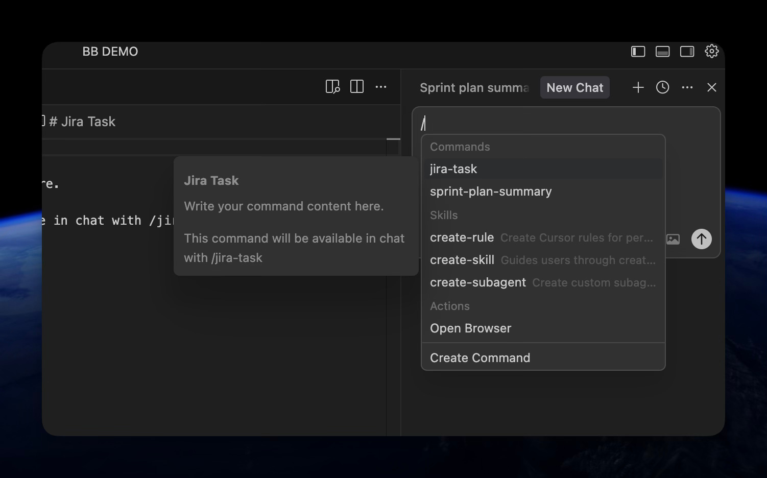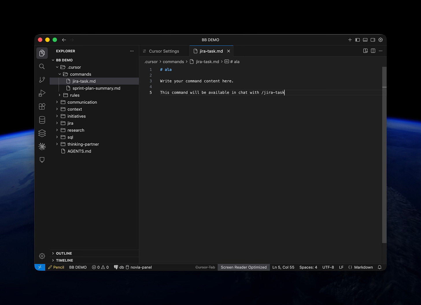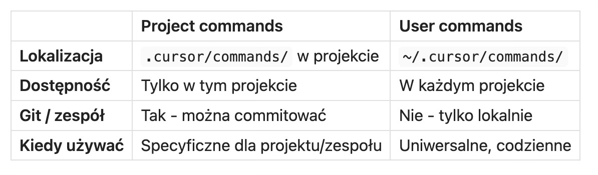Możesz tworzyć komendy bezpośrednio z interfejsu Cursora - w ustawieniach jest dedykowana sekcja Commands, gdzie dodasz nową komendę bez wychodzenia z aplikacji (tam też wybierasz poziom: project lub user).