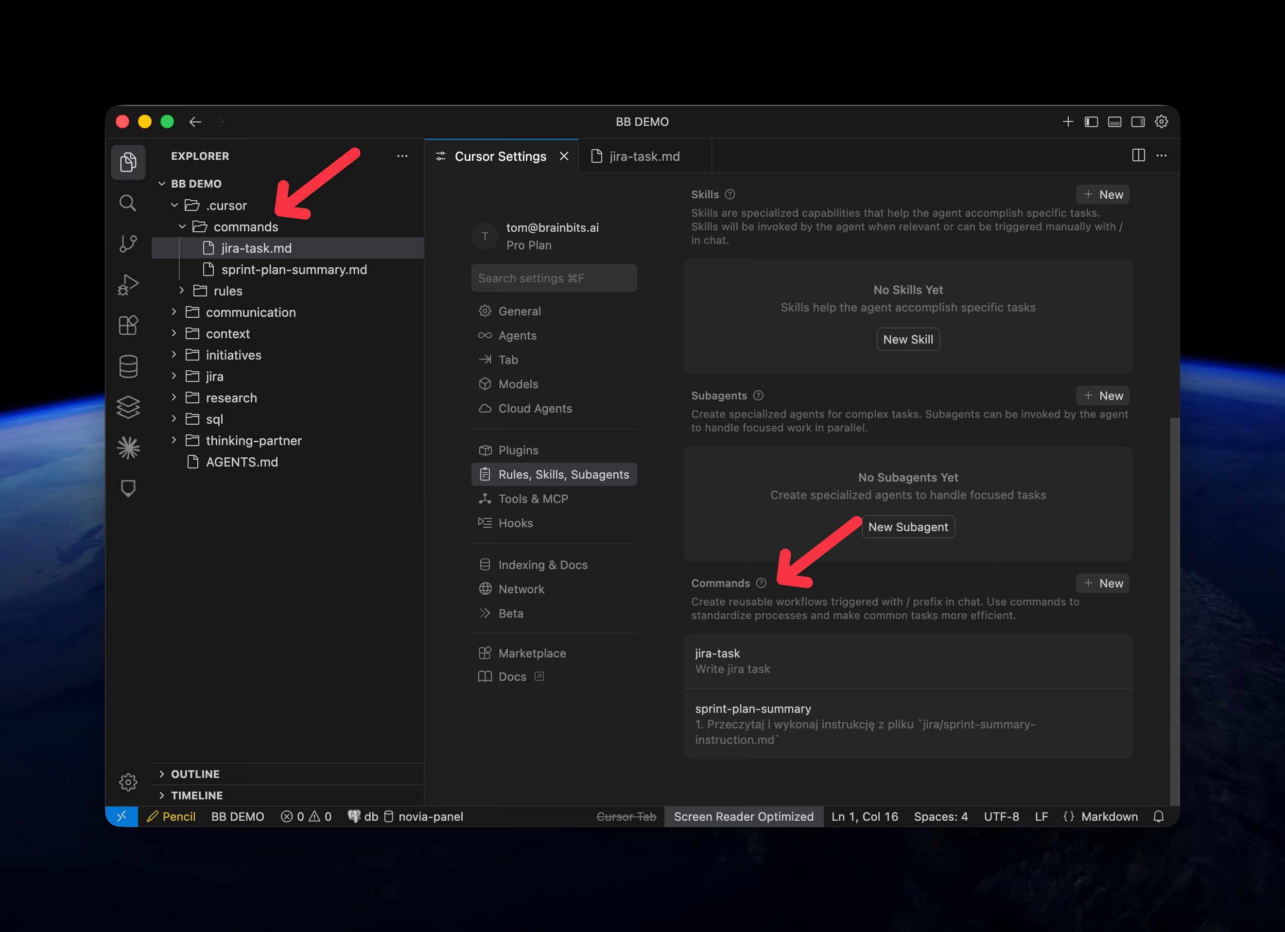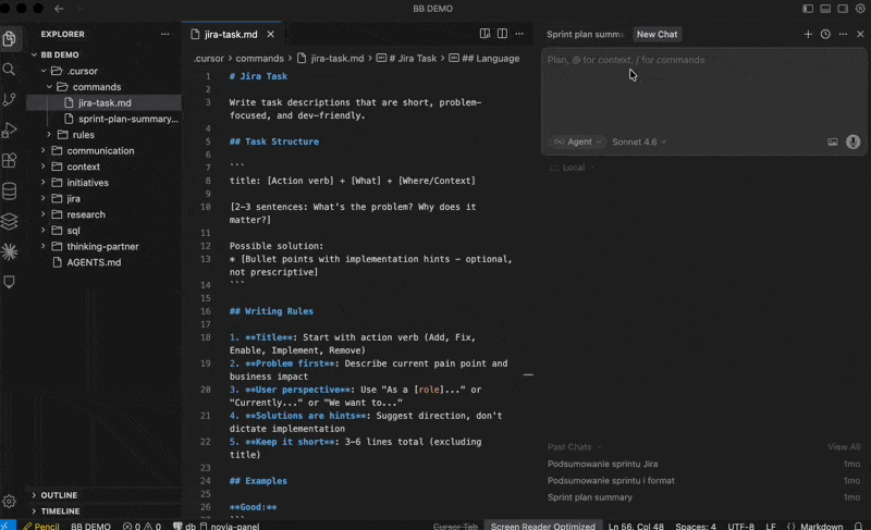 Moja praca z agentami AI - i Cursorem w szczególności - to zmieniła. Teraz konkretne komendy, w tym prompty które mi się sprawdzają, mogę zapisać wprost w projekcie i wywoływać jednym gestem. Bez szukania, bez kopiowania, bez tracenia kontekstu.