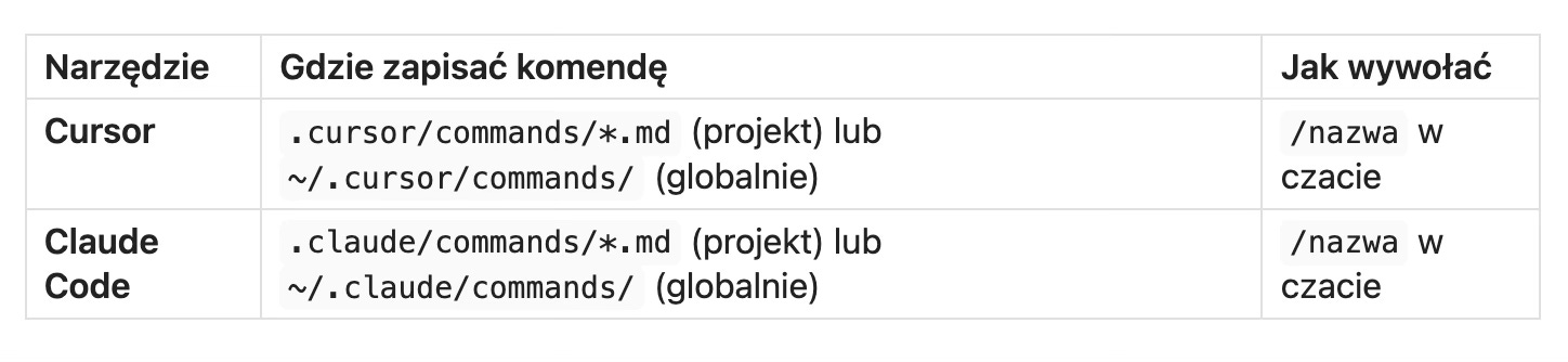 Jeśli już uczysz się tej filozofii w Cursorze - w Claude Code (lub innym systemie z agentami) będziesz się czuł jak w domu. Pliki komend mają tę samą strukturę Markdown, ta sama lokalizacja, ten sam sposób wywołania.