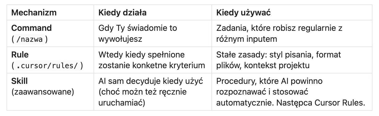 Commands to zapisane prompty lub procedury, które wywołujesz wpisując /nazwa w czacie Cursora (lub innego środowiska - takiego jak Claude Code czy Google Antigravity).