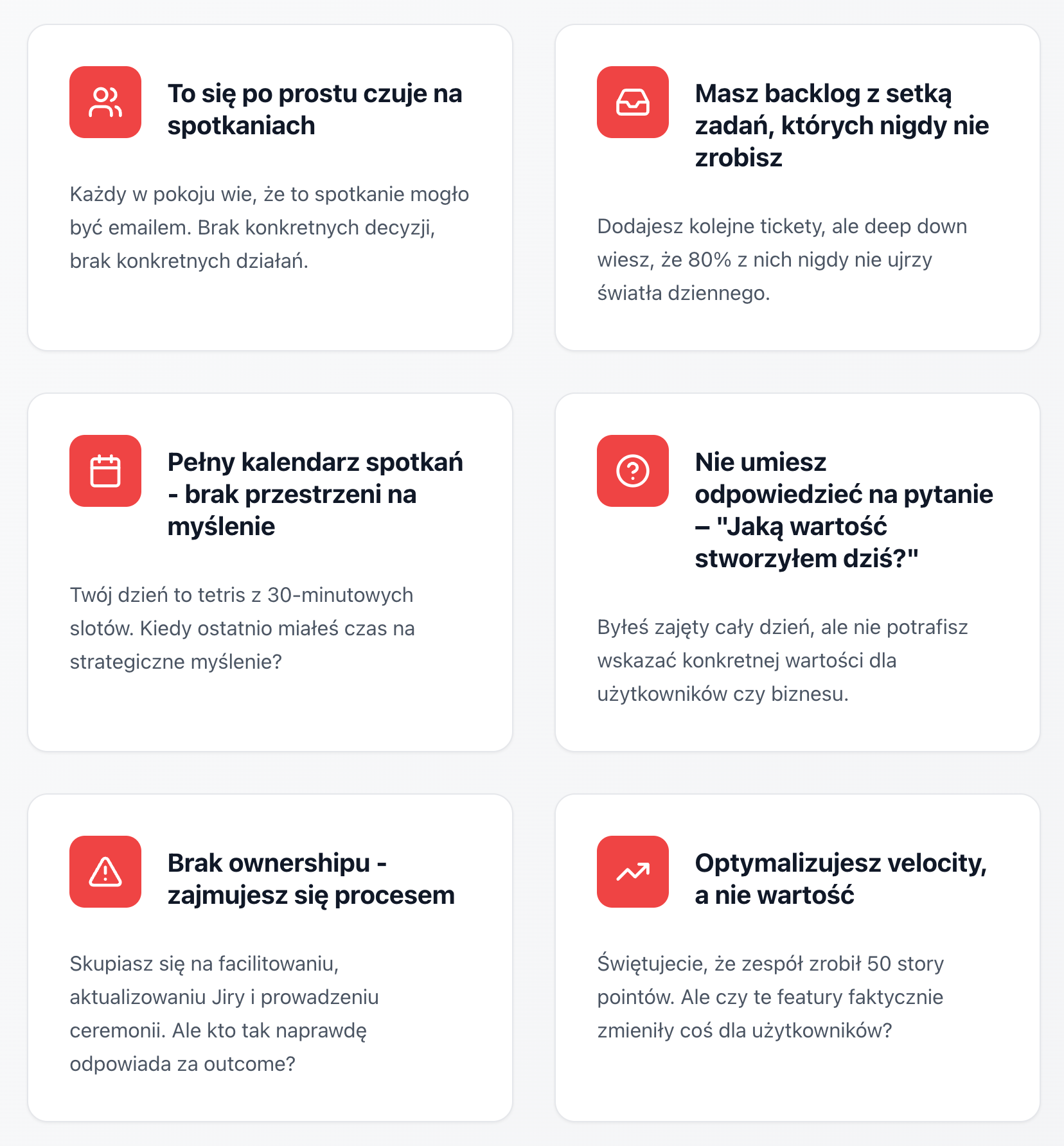 Zamiast mówić o problemach użytkowników, rozmawiacie głownie o technicznej kolejności tasków. To znak, że proces przejął kontrolę nad sensem.