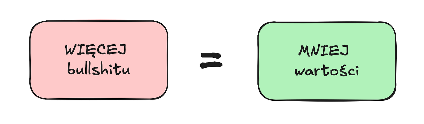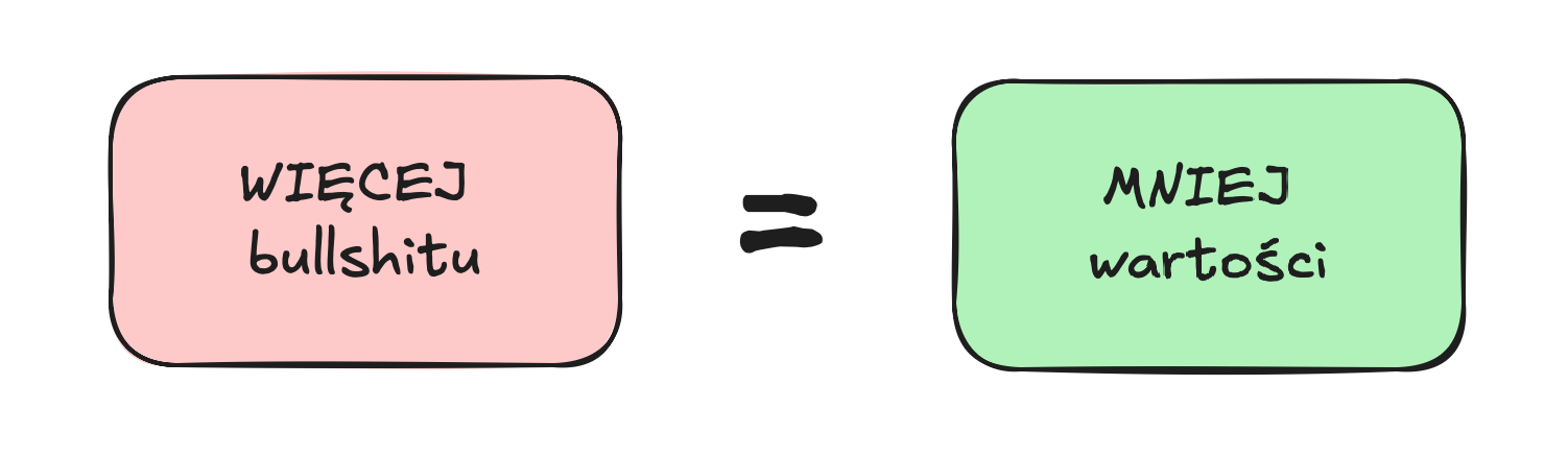 To jeszcze raz po polsku: „Sztuka robienia rzeczy, które nie tworzą wartości, ale wyczerpują Twoją energię.”. Można to sprowadzić do prostego równania: Więcej bullshitu = mniej wartości.