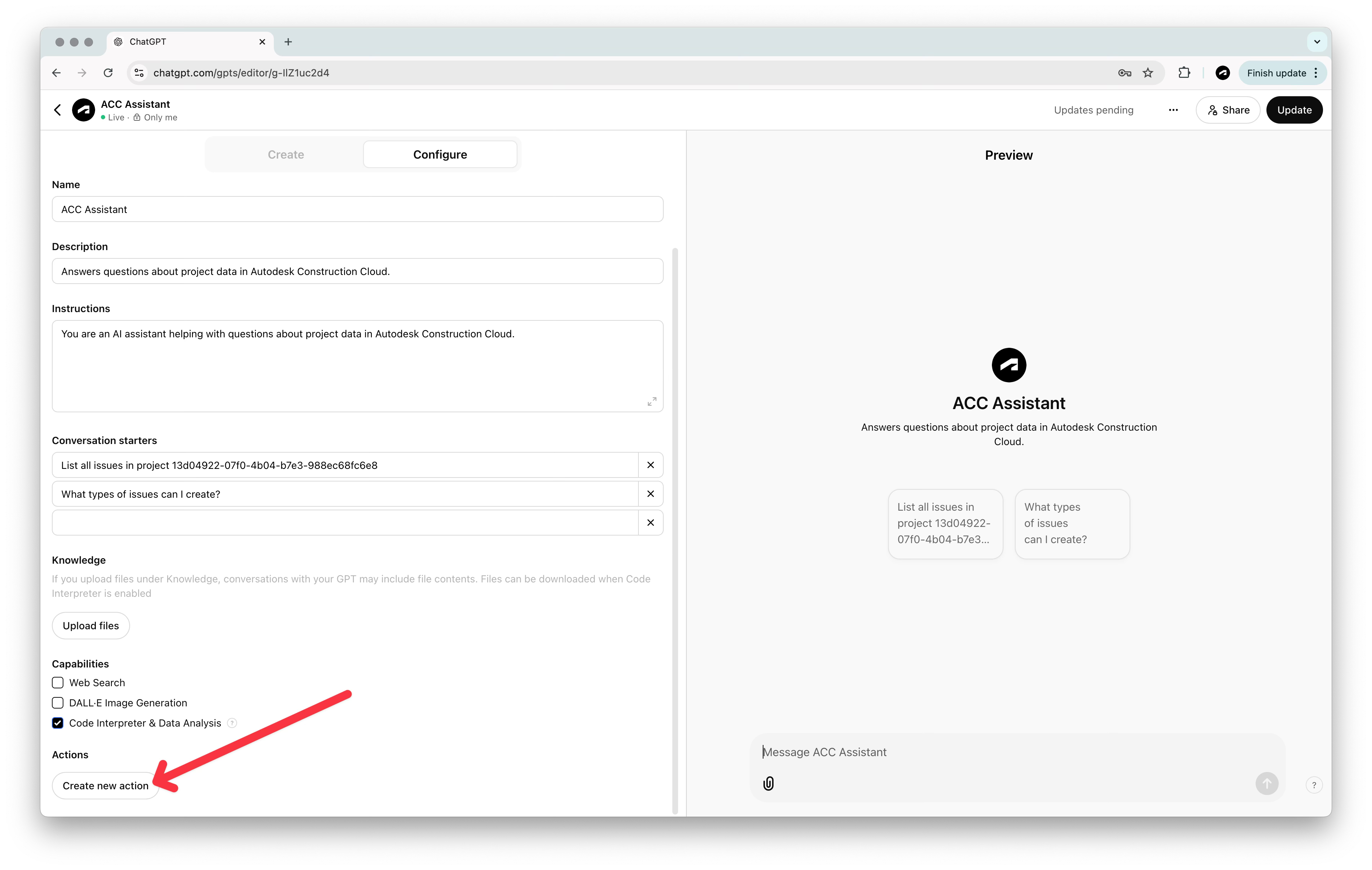 W interfejsie Custom GPT: