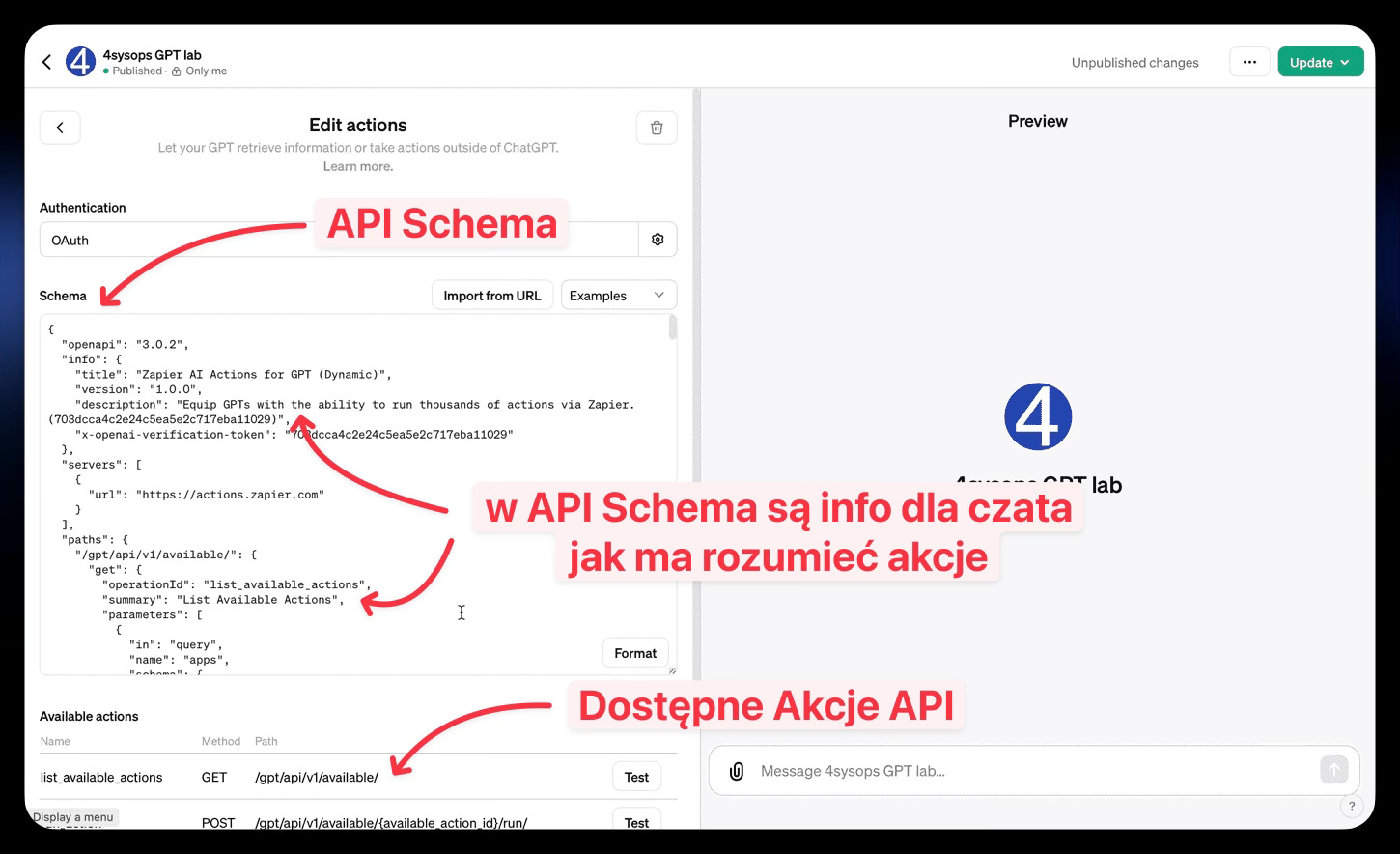 W dużym uproszczeniu: to mechanizm, który pozwala Twojemu GPT komunikować się z zewnętrznym oprogramowaniem za pomocą API (Application Programming Interface). Dzięki temu GPT wie, jakie komendy może wysłać do innego systemu i jakich odpowiedzi się spodziewać.