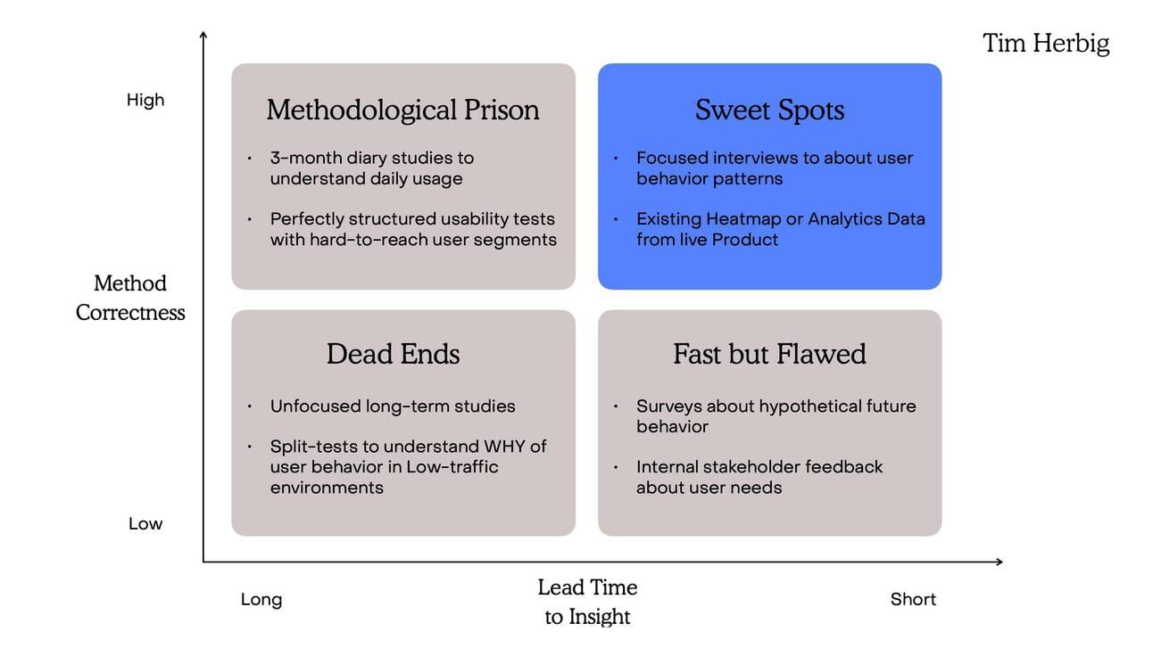 Tim Herbig w swoim artykule fajnie zwraca uwagę, że w naszych produktowych, szybko zmieniających się realiach, najbardziej „poprawna” metoda badawcza nie zawsze jest najlepszym wyborem. Bardzo często dużo ważniejsze jest to, jak szybko dostarczy nam wiarygodne insighty.