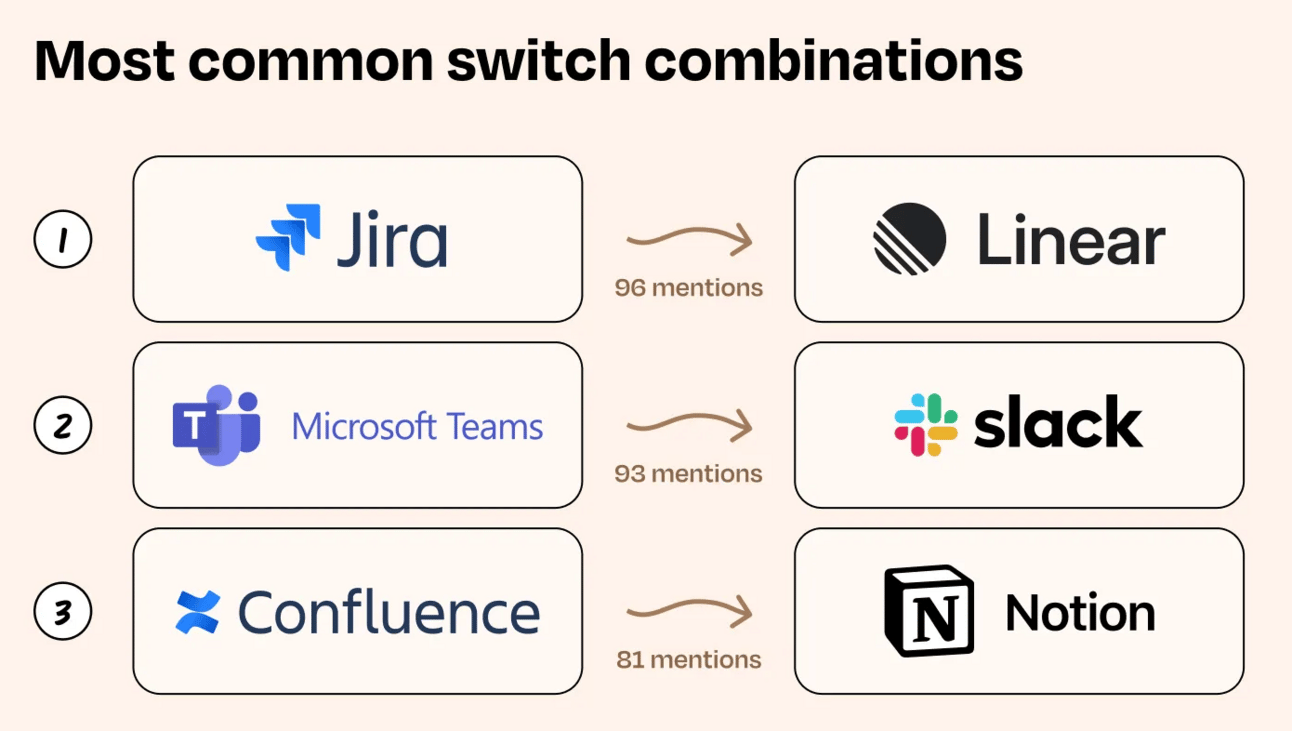 Google Docs remains a go-to for collaboration, but Notion is gaining steam. Notion is seen as “good for everything,” and it’s catching up to the big players, with 37% of respondents preferring it. Notion also came in second place for project management after Jira and fourth place for CRM.