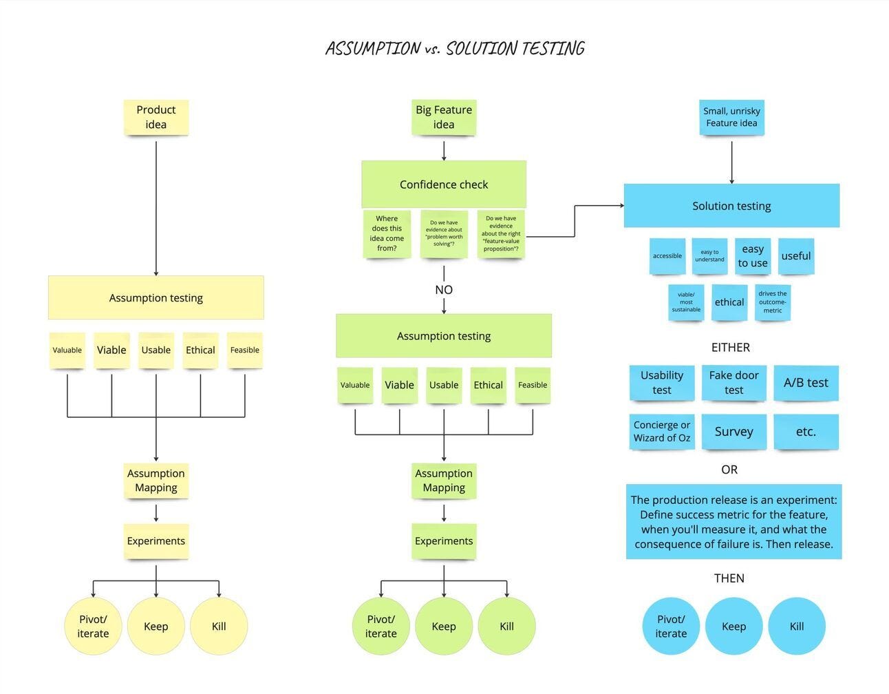 Na koniec jeszcze fajnie rozrysowany przez Büşra Coşkuner na Linkedin proces walidacji rozwiązania w product discovery - kiedy lepiej skupić się na testowaniu założeń, a kiedy całego rozwiązania: