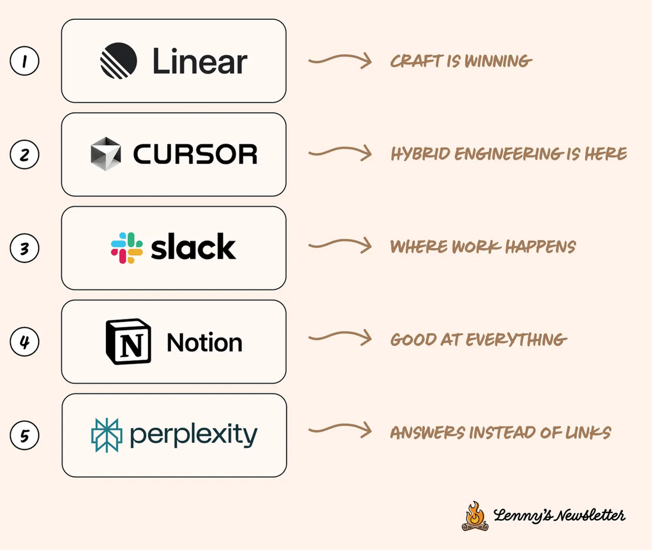 Coś, co jest popularne, wcale nie musi być dla nas wartościowe. Często firmy używają jakiegoś narzędzia, głównie dlatego, że jest w pakiecie (np. MS Teams vs Slack). Dlatego Lenny zapytał ankietowanych o to, jakie narzędzia dają im najwięcej wartości.