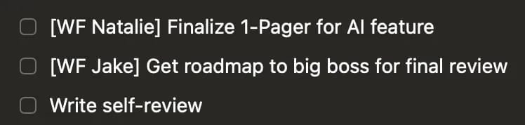 This tactic also comes from the Getting Things Done framework, and it changed my life. One of the most important habits of highly effective PMs is creating an aura of “I got this,” and the best way to build that aura is to never drop the ball. This tactic allows you to keep track of every open thread, versus relying on your memory, and makes it easy to remember to check in when someone else is dropping the ball. Once your brain knows that the information is written down somewhere, it can relax and create space for much more valuable thinking.