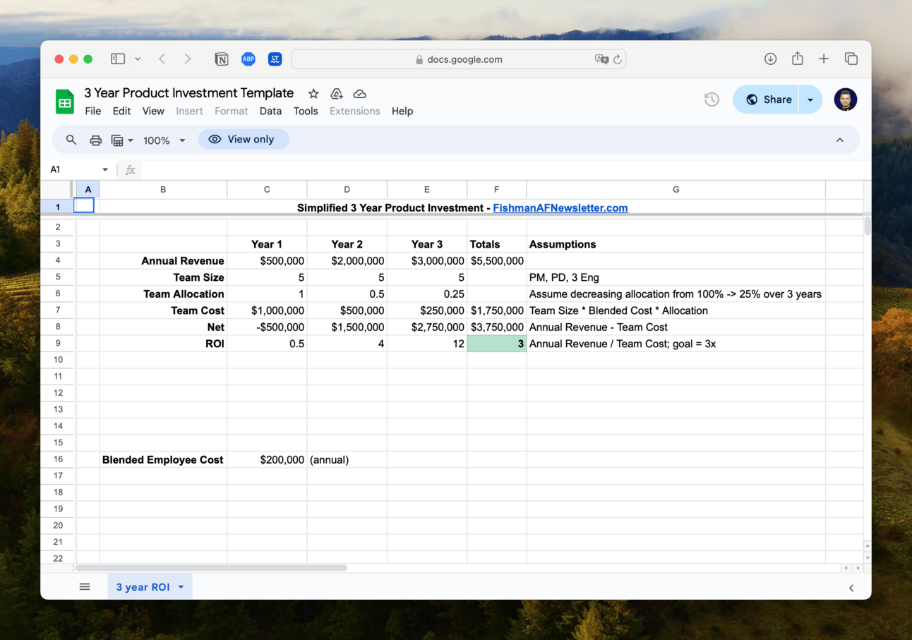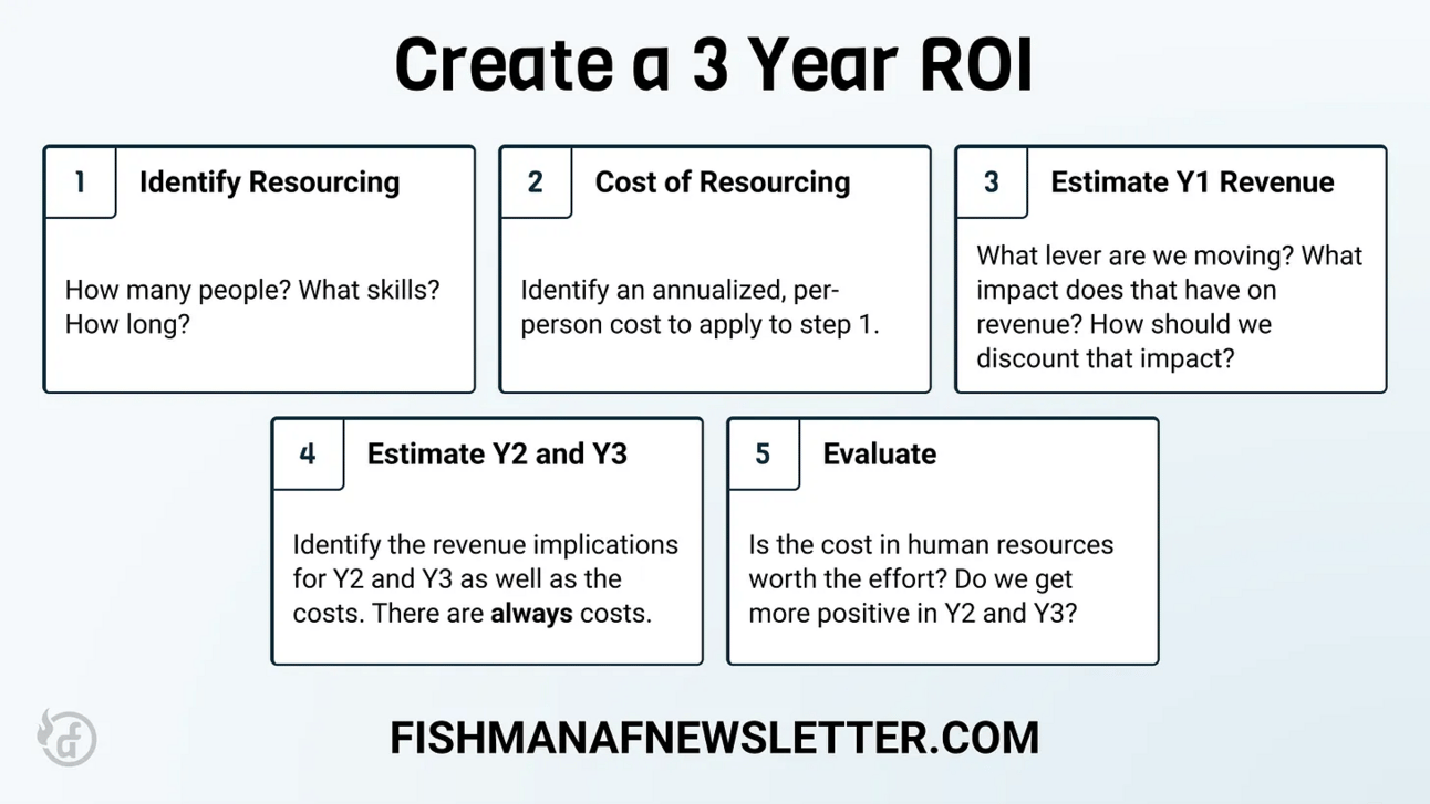 Because the meter is already running on team cost it’s a good idea to be reasonably confident in revenue generated by your investments at this stage. If you’re not that confident you can tone down the estimates or assume very little in Year 1. In general I recommend discounting by 70-90% if you’ve never worked in this area before, 30-50% if you’ve got some experience but limited quantitative data