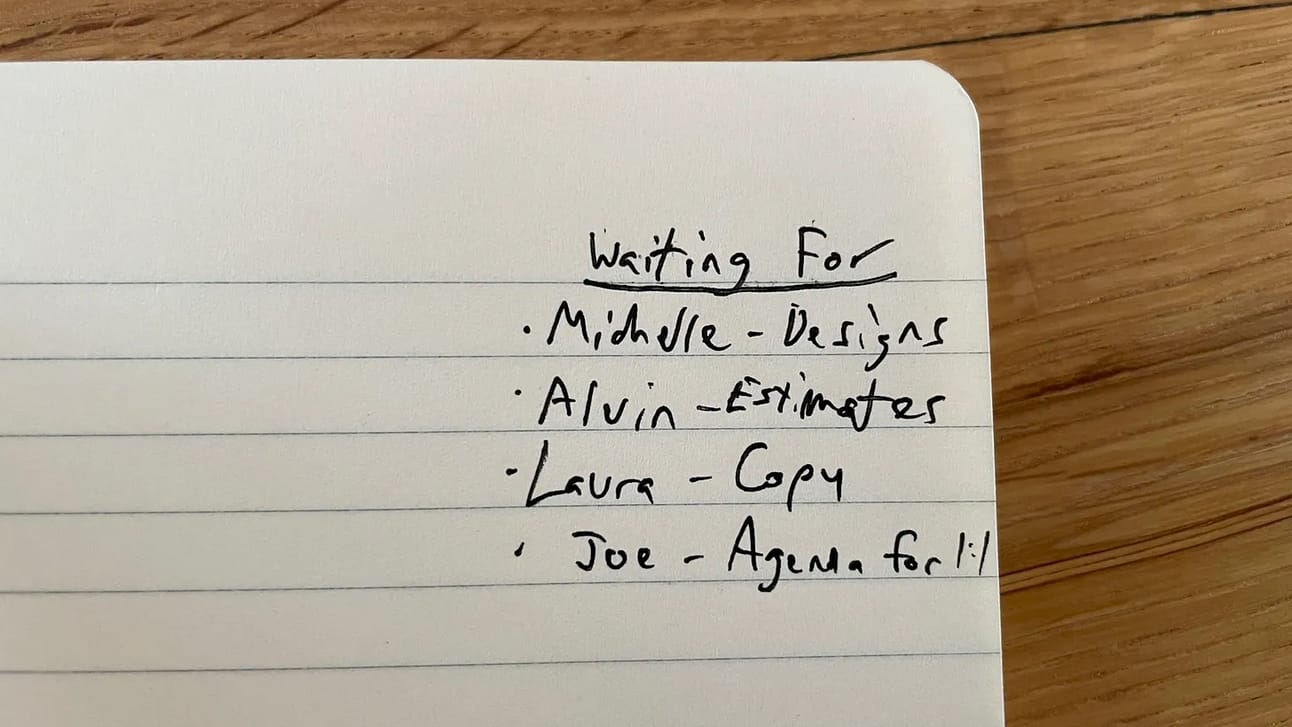 Whenever you ask someone to do something for you, add them to your “waiting for” list. I keep this alongside my to-do list: