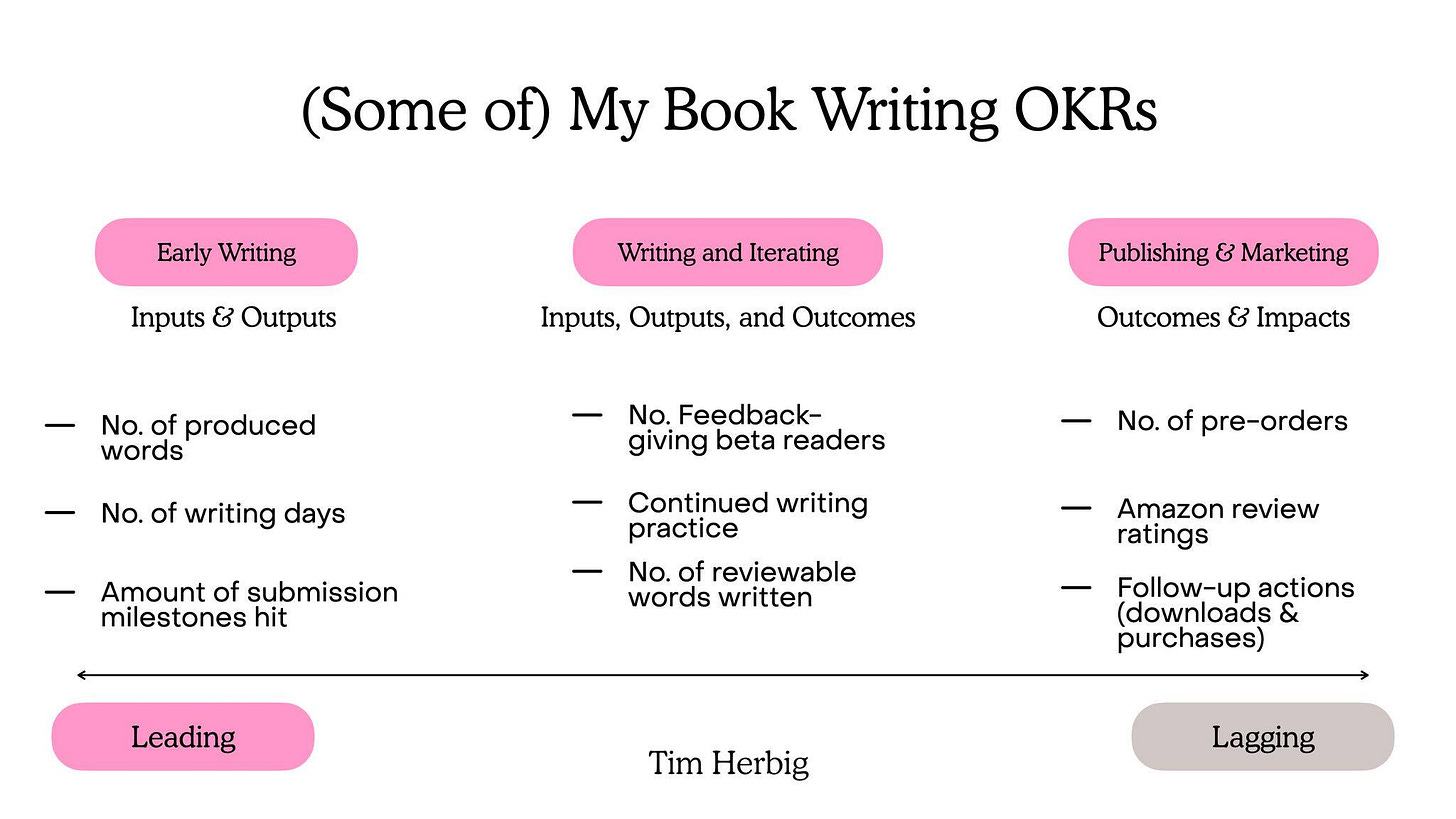 Często na szkoleniach ten przykład też się pojawia, czyli OKR dla osoby, która pisze książkę. Tim sam się realnie z tym zderzył, bo… pisze książkę :P.