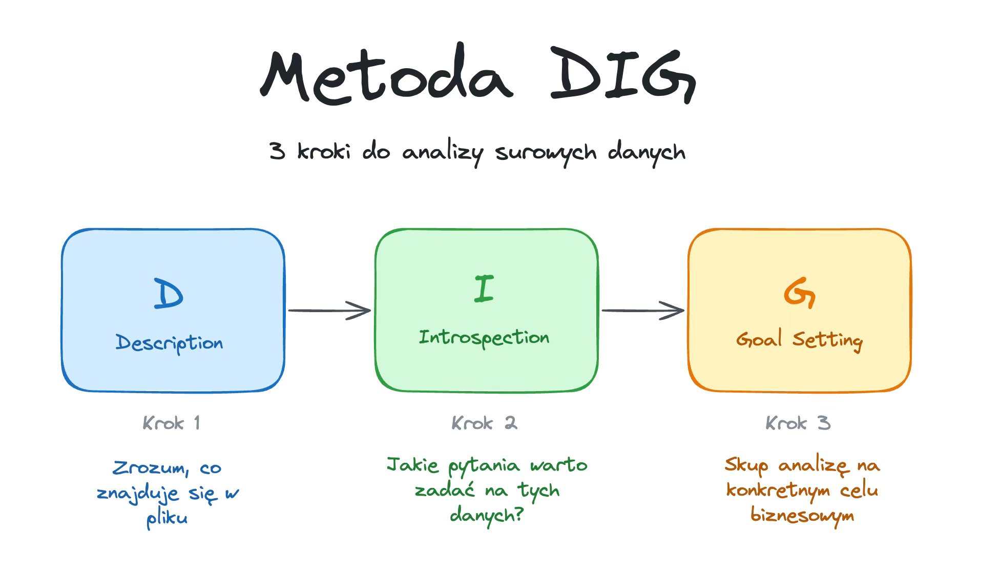 Metoda, którą poznasz, to DIG. Jest to uproszczona wersja standardowej branżowej metodyki EDA (Exploratory Data Analysis). Nazwa DIG jest łatwiejsza do zapamiętania, a zasady są podobne.