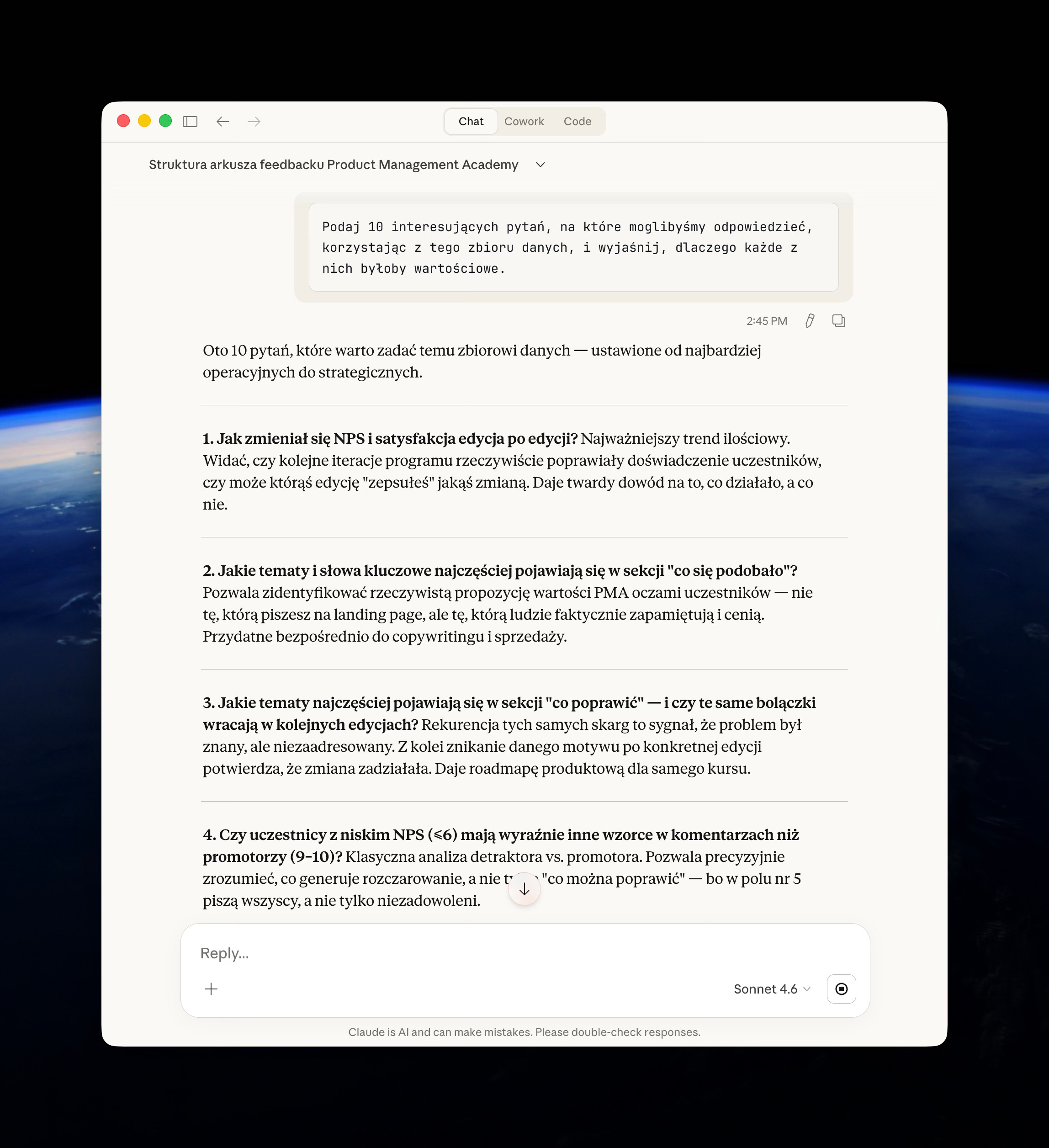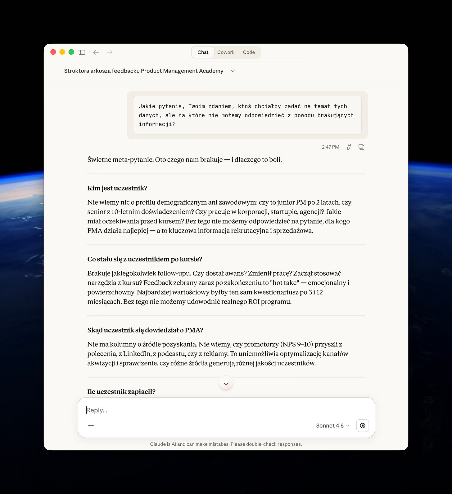 Masz przed sobą arkusz feedbackiem uczestników Product Management Academy. Co dokładnie zawiera ten arkusz? Wymień wszystkie kolumny w załączonym arkuszu i pokaż mi próbkę danych z każdej z nich.Zmuszasz AI do przejrzenia każdej kolumny w zbiorze danych.
