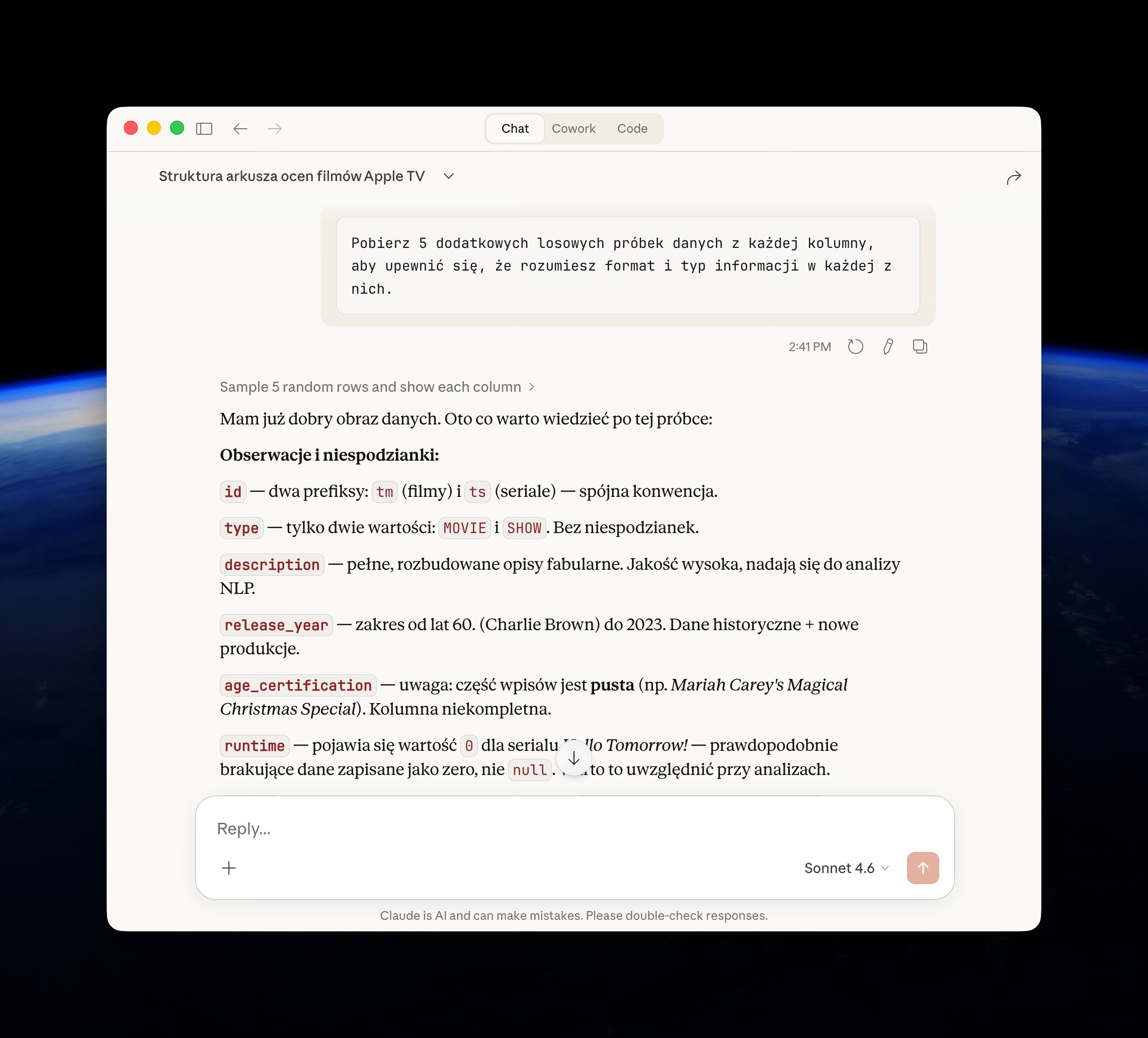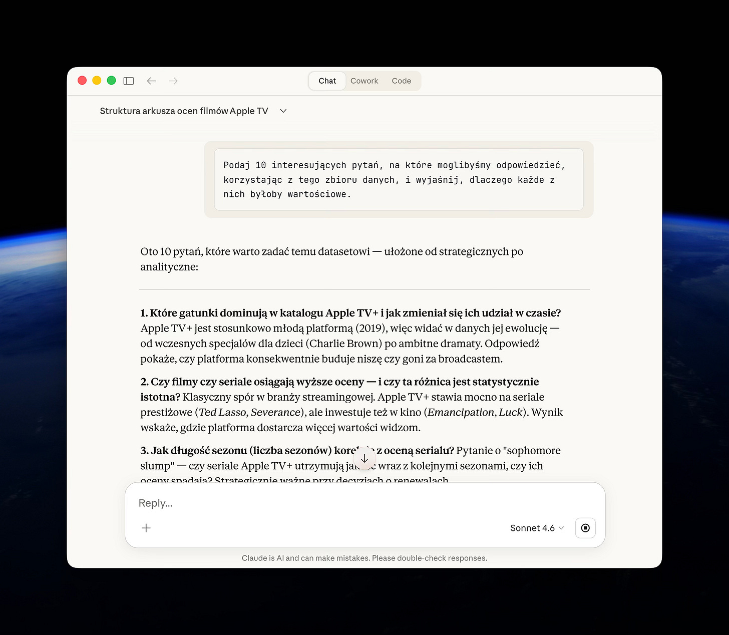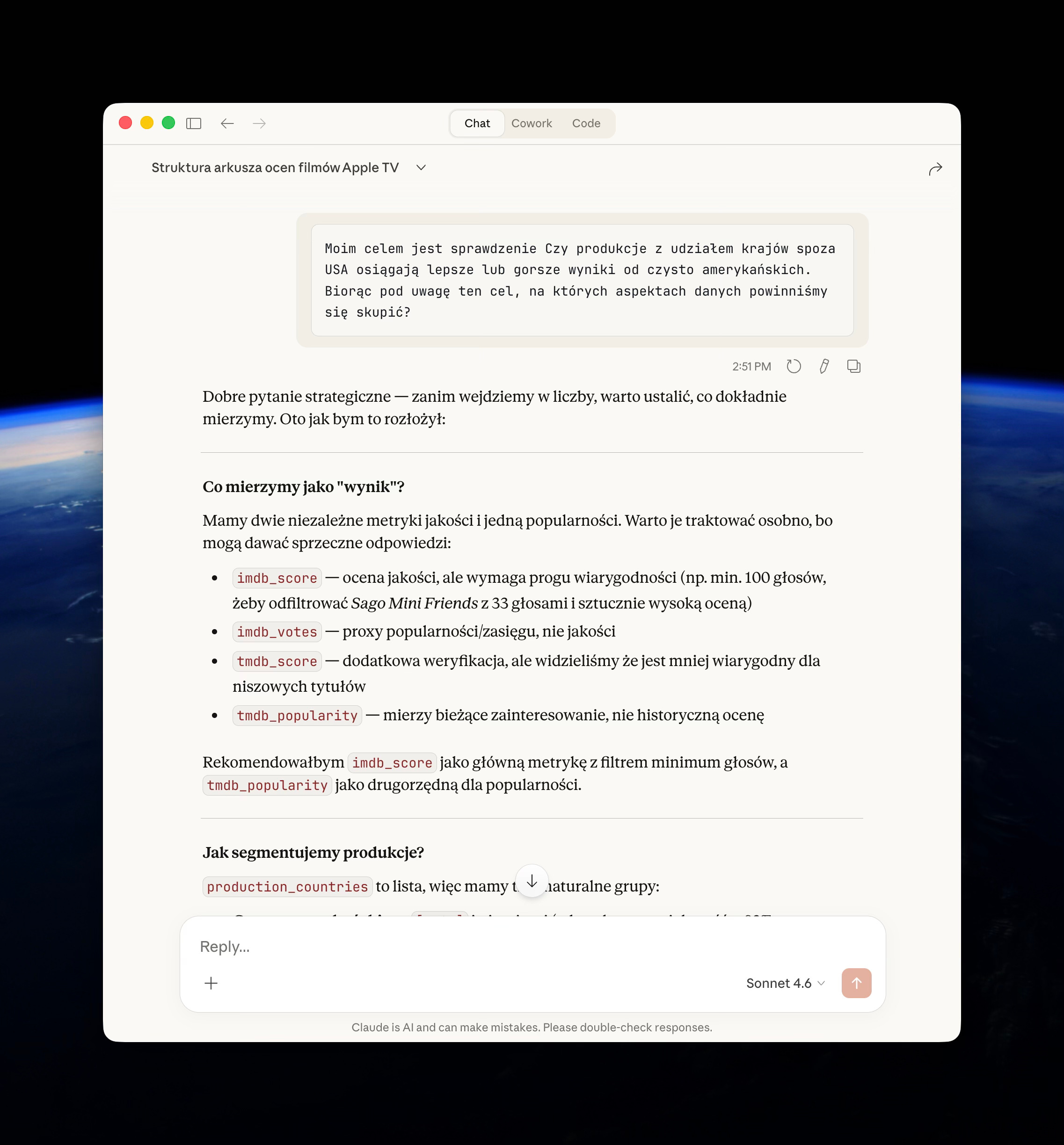 W przypadku datsetu AppleTV i mojej analizy: “Czy produkcje z udziałem krajów spoza USA osiągają lepsze lub gorsze wyniki od czysto amerykańskich” - asystent fajnie wyłapał że musimy to doprecyzować, np: