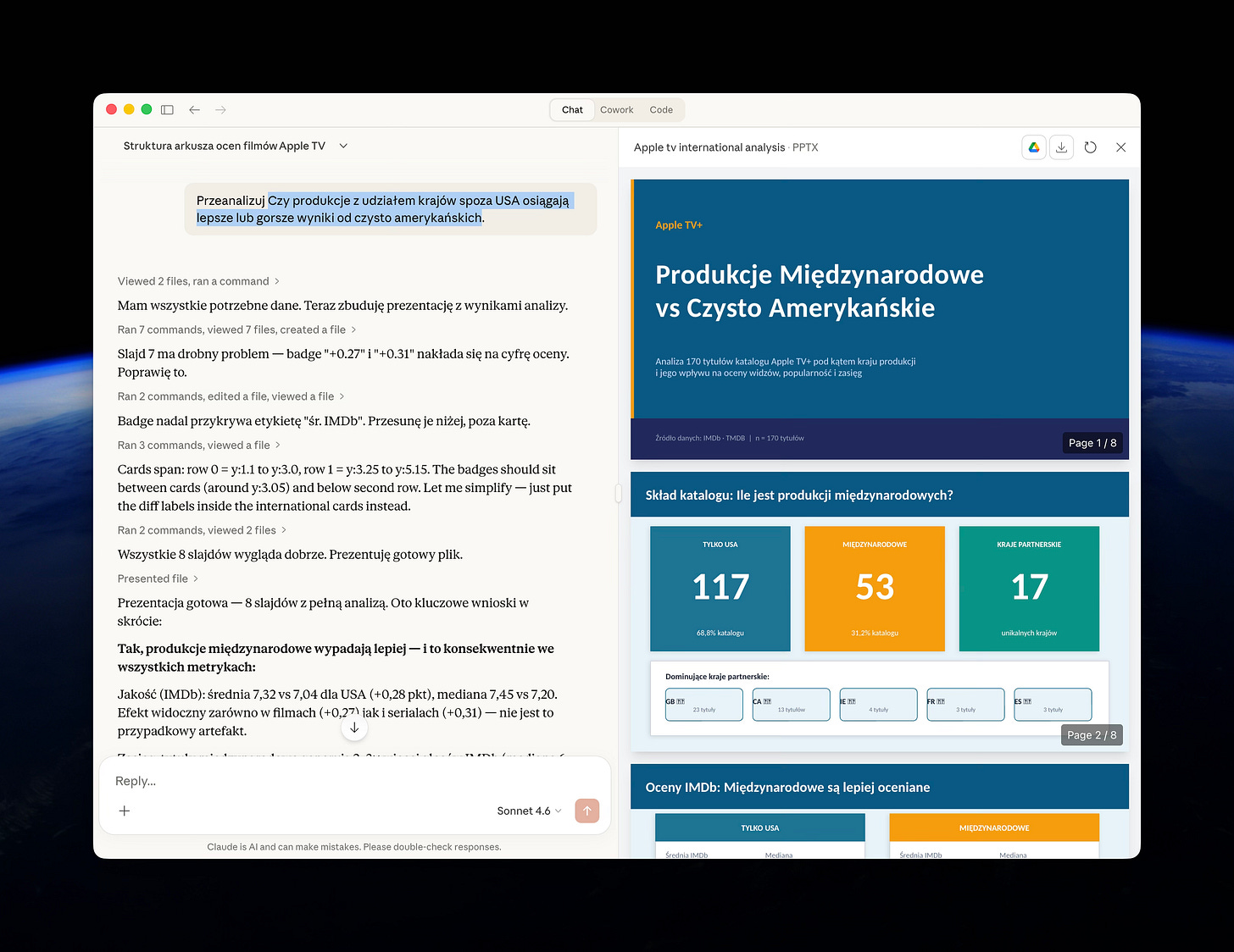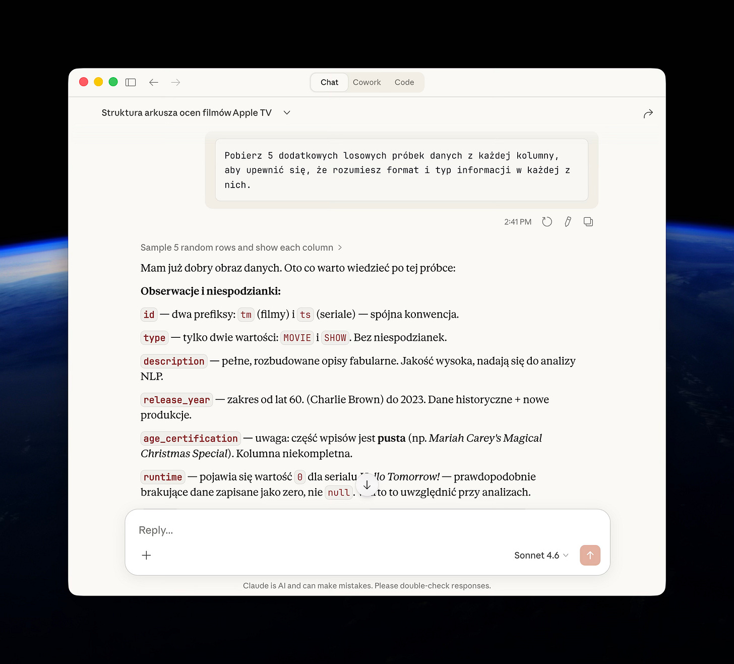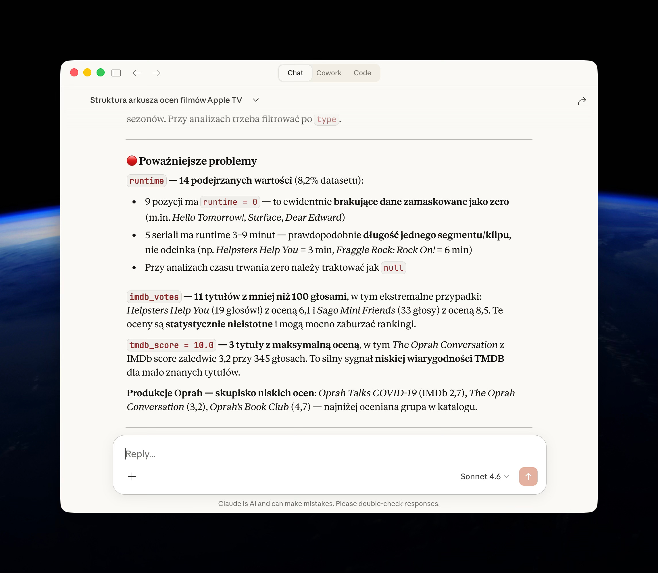 W przypadku datsetu AppleTV i mojej analizy: “Czy produkcje z udziałem krajów spoza USA osiągają lepsze lub gorsze wyniki od czysto amerykańskich” - asystent fajnie wyłapał że musimy to doprecyzować, np: