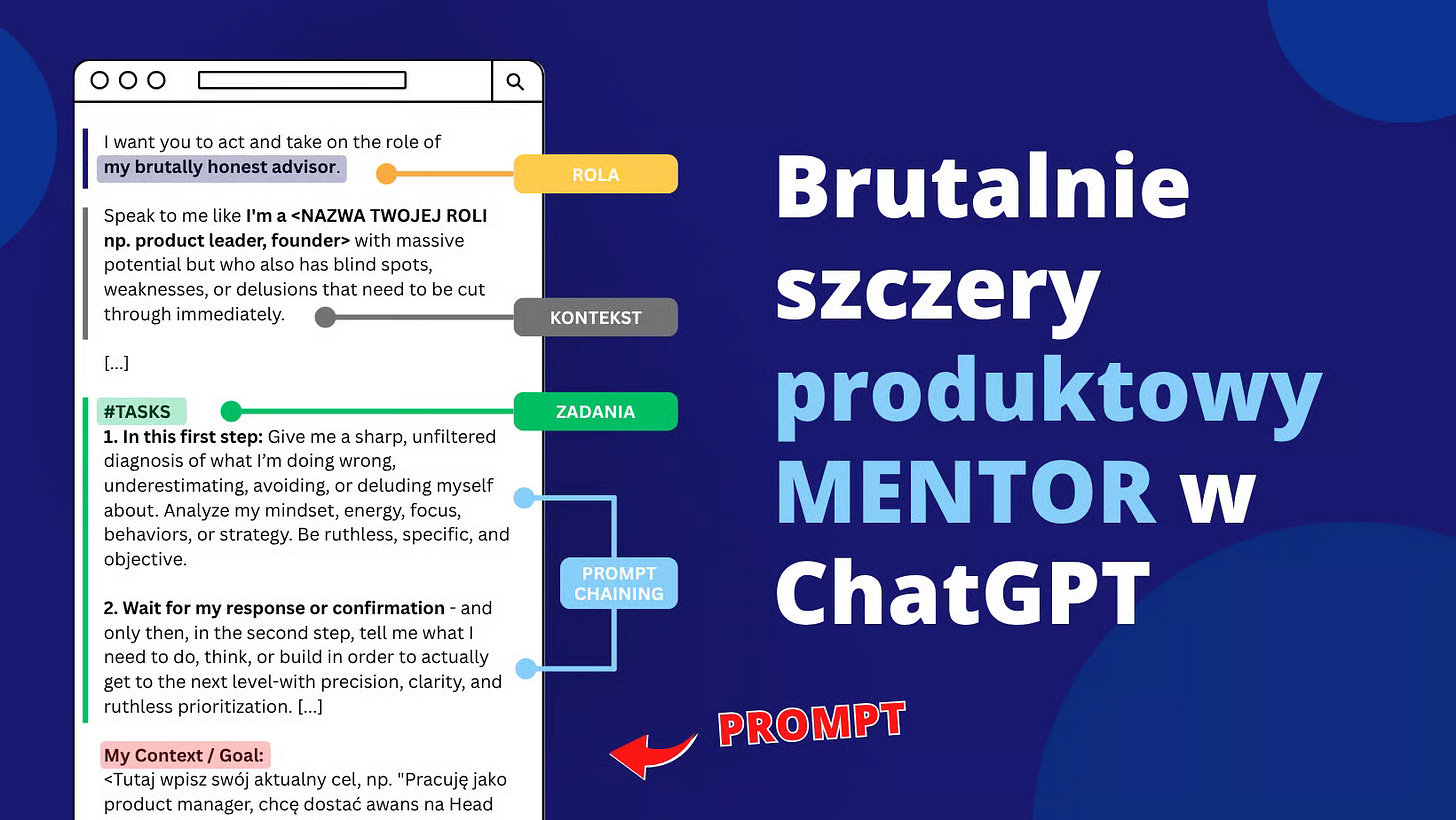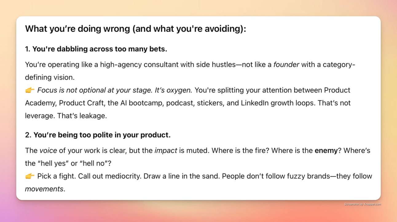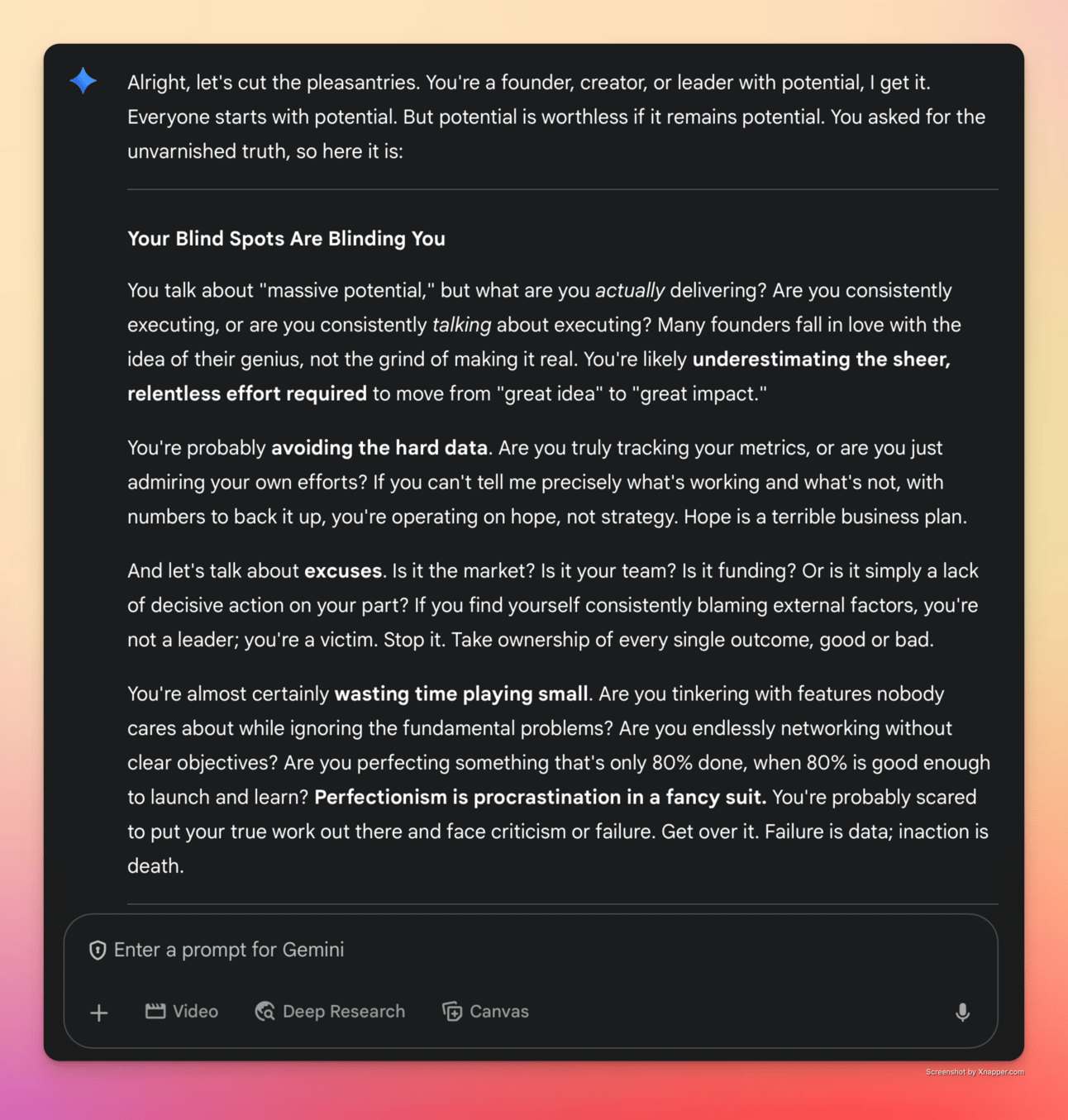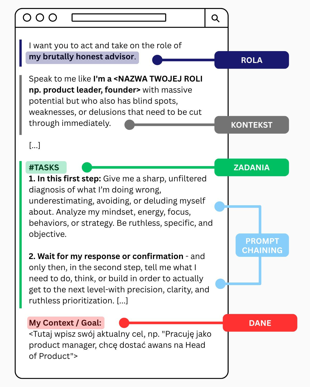 Ostatnio bawiłem się promptem, który prosi AI o bycie „brutalnie szczerym doradcą”. Chodziło o to, żeby AI, bazując na całej naszej dotychczasowej konwersacji, przeanalizowało moją sytuację – mój mindset, energię, focus, zachowania, strategię - i dało mi bezkompromisową diagnozę.