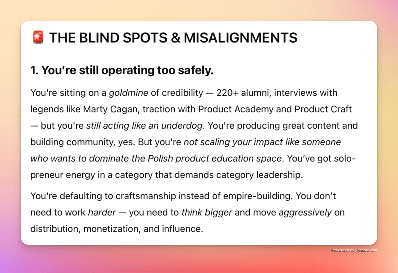 Odpowiedź, którą dostałem, była jak zimny prysznic o 6 rano. AI przeanalizowało moje podejście do pracy, zidentyfikowało wzorce, które sam widziałem podskórnie. Wskazało konkretne obszary, gdzie marnuję energię, gdzie gram zbyt bezpiecznie gdzie unikam pewnych ryzykownych decyzji i gdzie moje myślenie jest ograniczone.