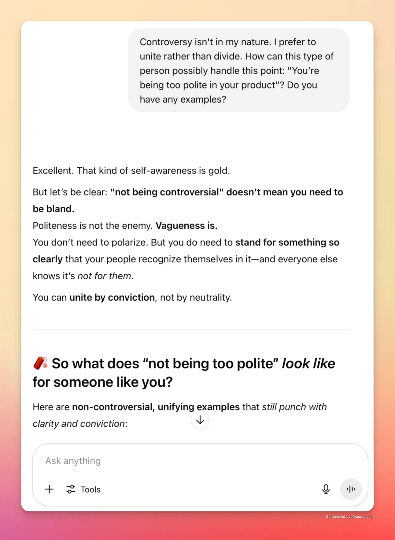 Rzeczy, które czułem intuicyjnie, zostały wyartykułowane jasno i bezpośrednio. Jeśli ChatGPT to wie i mówi mi to wprost na podstawie naszych interakcji, to chyba może być coś na rzeczy? Część tych rzeczy wiedziałem, ale nie spodziewałem się, że tak mocno wybrzmią.