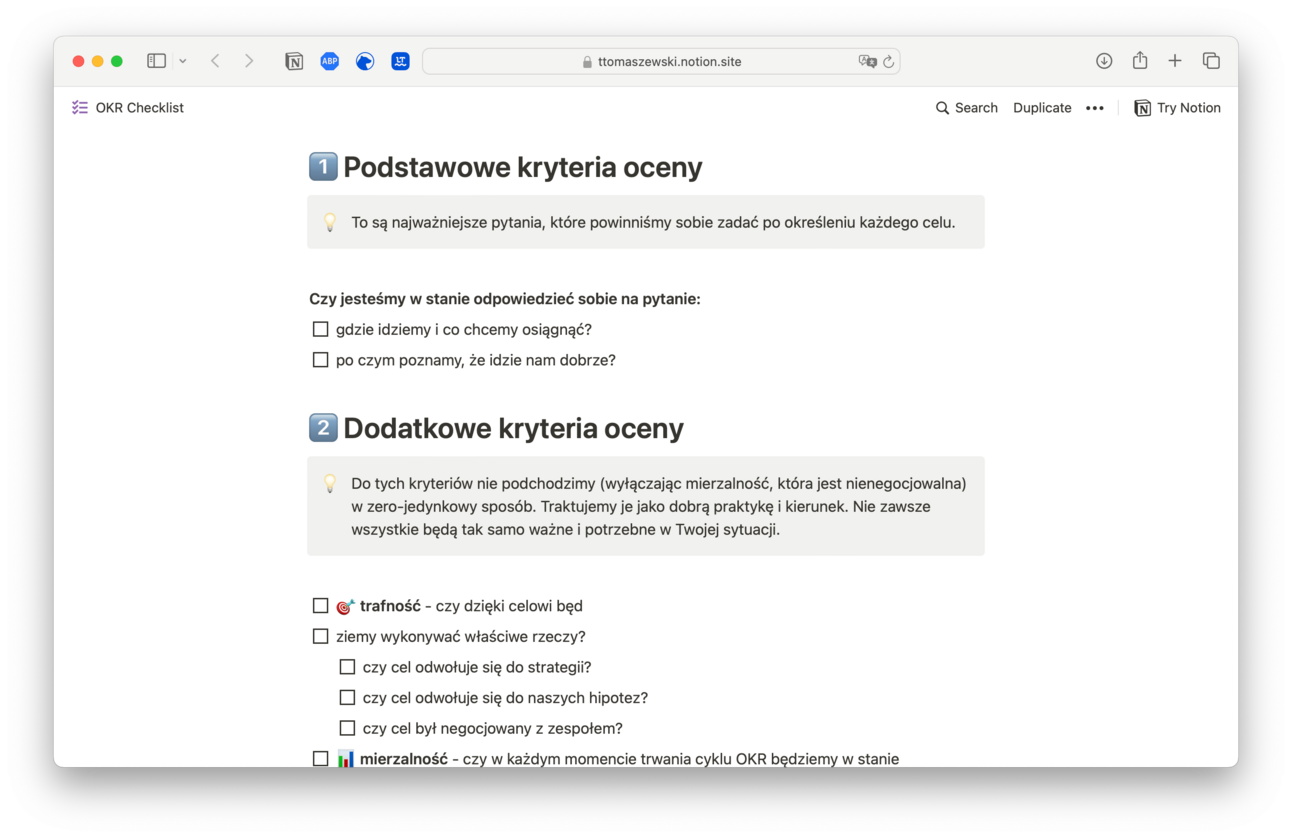 Na koniec przygotowałem krótką checklistę (w Notion), której możesz użyć jako finalny krok sprawdzanie każdego OKRa (przez Ciebie lub Twój zespół). Zebrałem w niej najważniejsze kryteria, które pojawiły się w tym artykule.