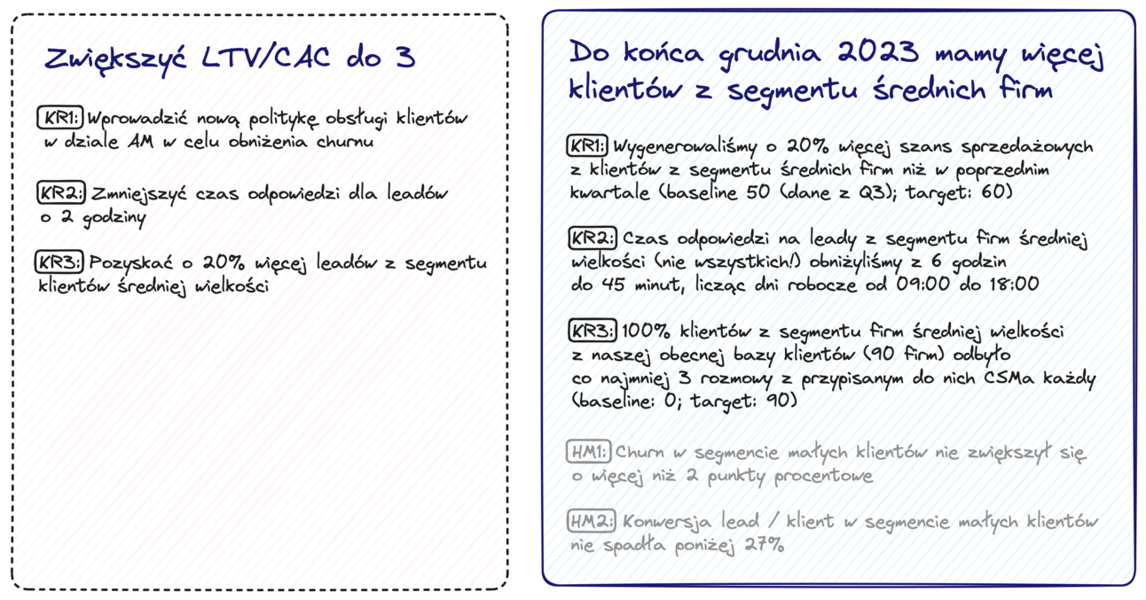 zawierały głównie lead metrics (kwartalne OKRy) lub głównie lag metrics (roczne OKRy)