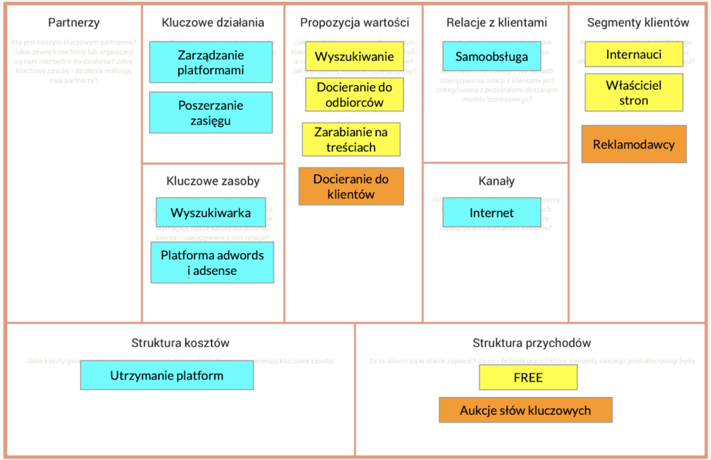 [15-20 min] Wspólny przykład – po zaprezentowaniu szablonu dobrze razem przynajmniej raz wypełnić BMC w praktyce. Pomoże to uczestnikom poczuć się pewniej z wykorzystaniem samego szablonu. Możemy pozwolić uzupełnić BMC samodzielnie, w grupach lub od razu razem na tablicy/flipcharcie. Jako przykład niech posłuży, któraś ze znanych firm lub produktów. Ja zwykle wykorzystuje do tego Google, które przecież wszyscy doskonale znamy.