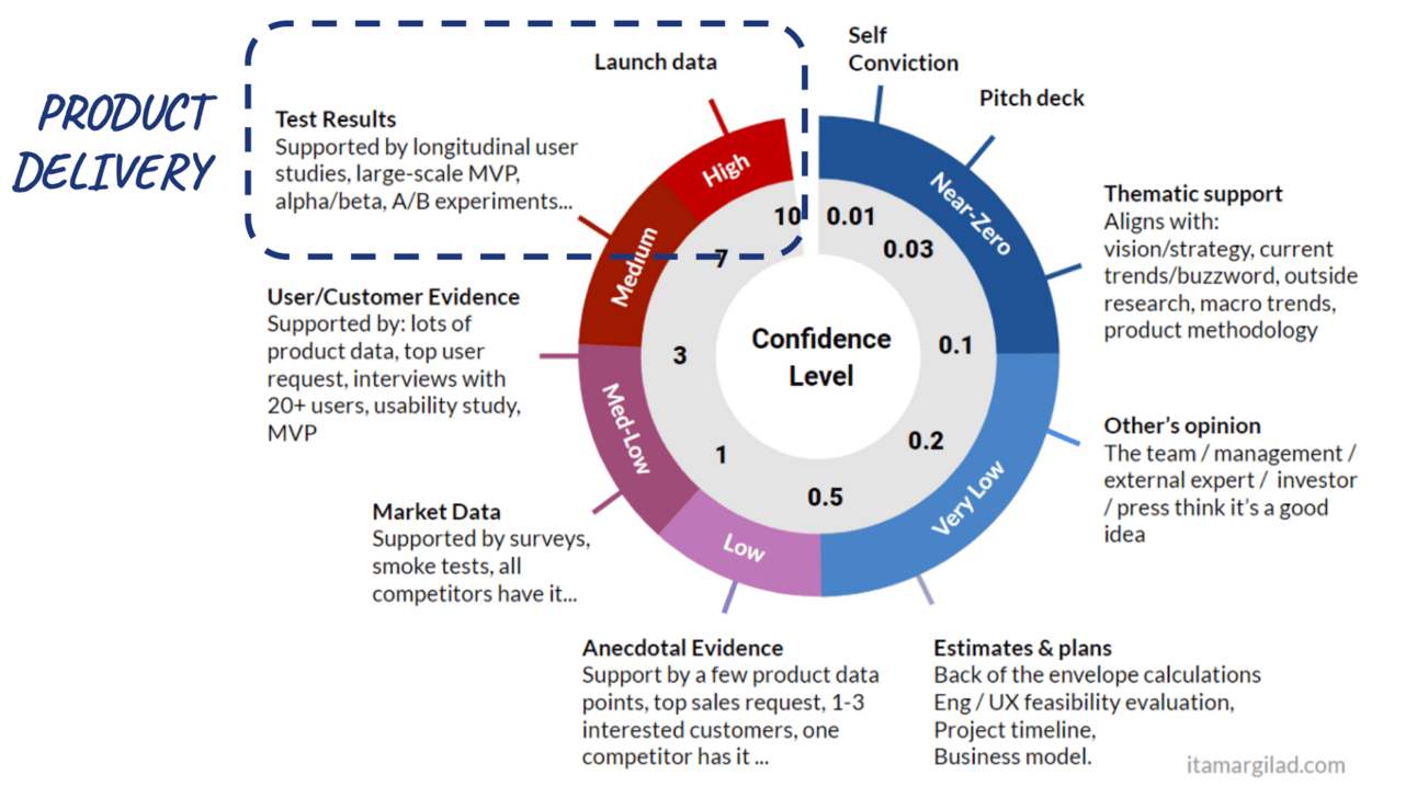Dostarczenie rozwiązania jest zwykle najdroższą metodą testowania naszego pomysłu i robienia discovery, ale… wciąż jednak to jest sposób na redukowanie niepewności (i tym samym forma discovery). Itamar Gilad świetnie to pokazuje na swojej skali niepewności produktowej: